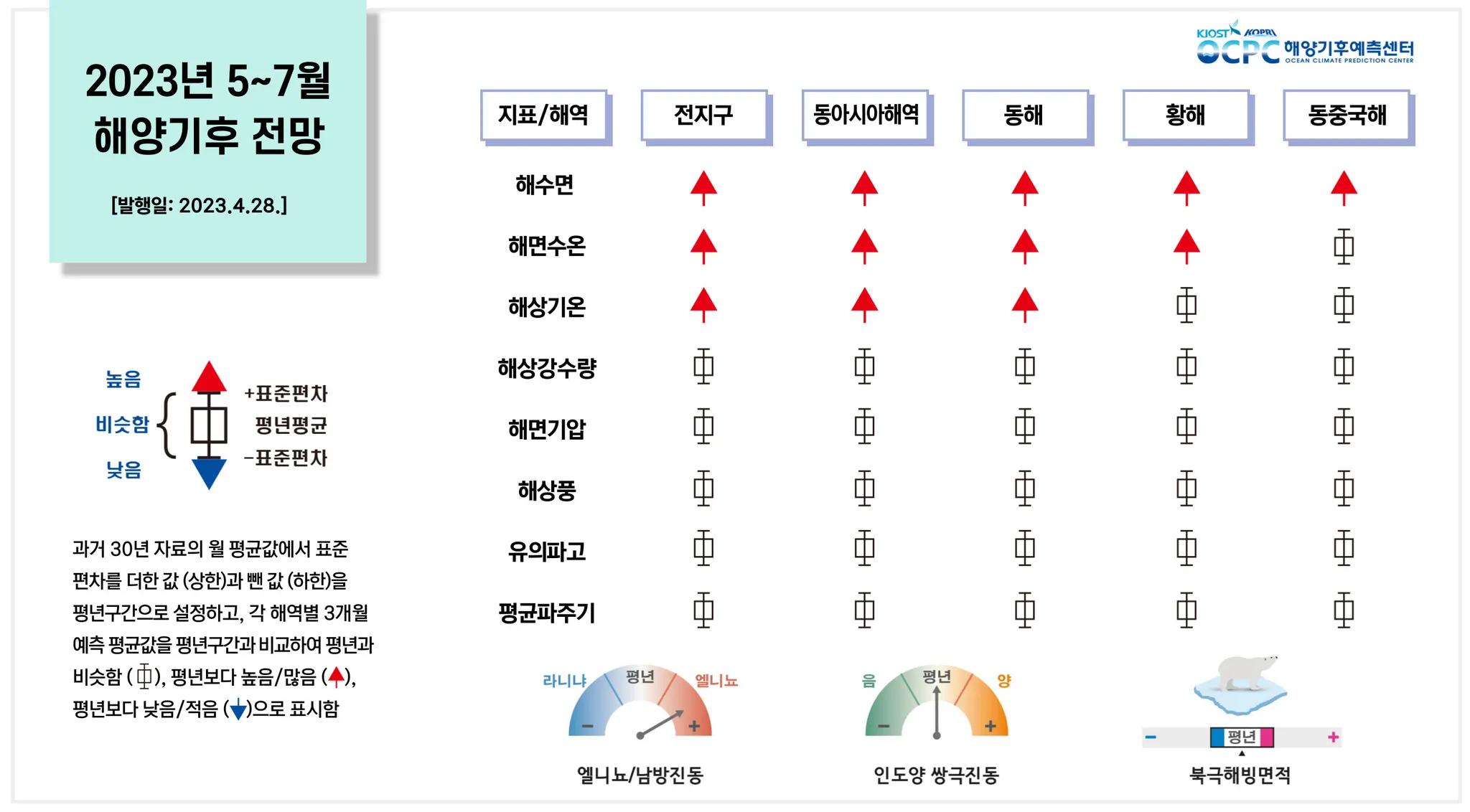 3개월(5,6,7월) 평균 전망: 해수면, 해면수온, 해상기온 모두 대부분의 해역에서 평년보다 높고, 엘니뇨가 발생할 것으로 전망됩니다.