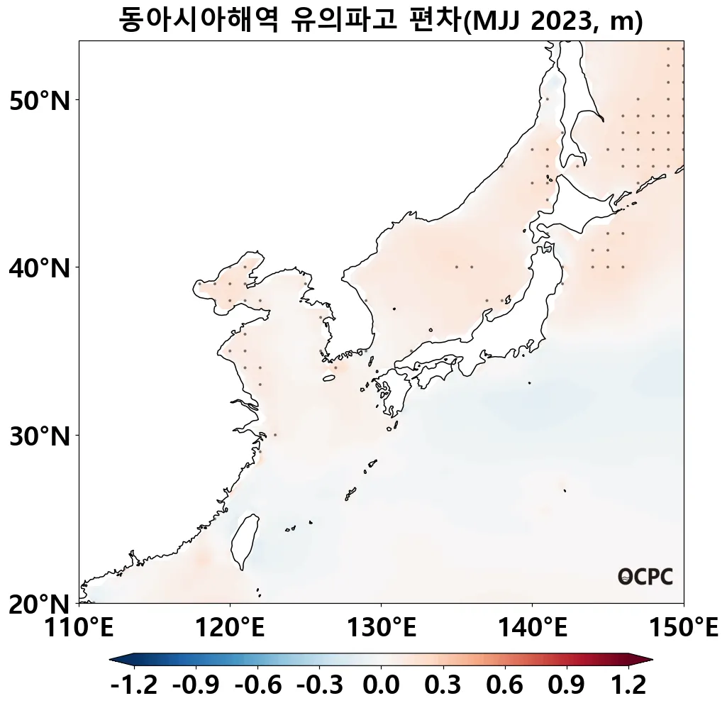 A-B. 동아시아해역 유의파고 편차 전망(2023년 5~7월 평균, 점표시: 평년 표준편차 초과 해역)