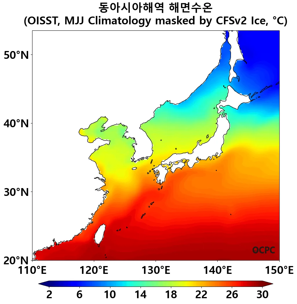 B. 동아시아해역 해면수온(평년 5~7월 평균), 예상 해빙 해역 제외