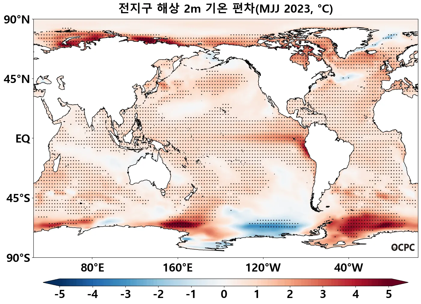 A-B. 전지구 해상기온 편차 전망(2023년 5~7월 평균, 점표시: 평년 표준편차 초과 해역)