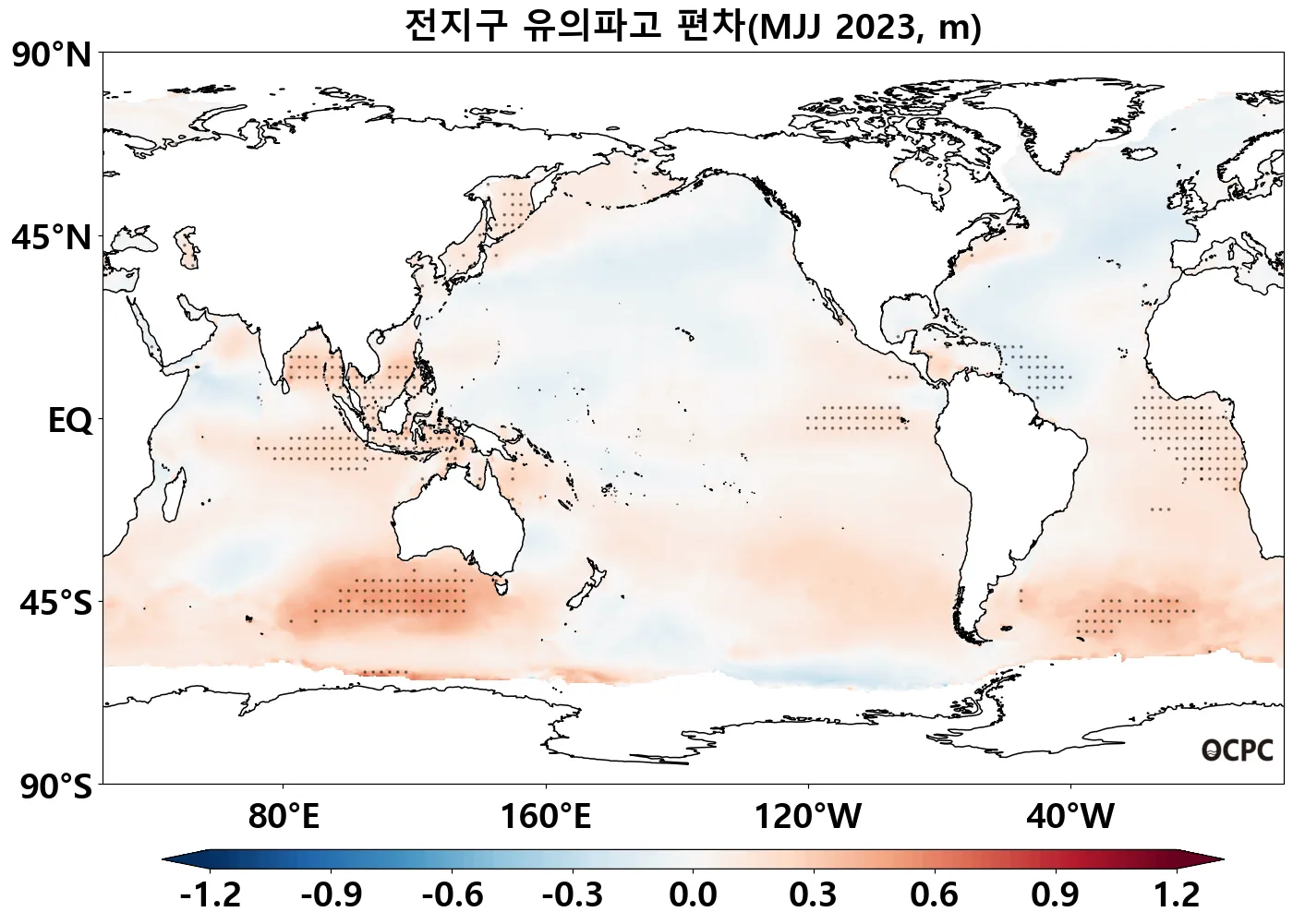 A-B. 전지구 유의파고 편차 전망(2023년 5~7월 평균, 점표시: 평년 표준편차 초과 해역)