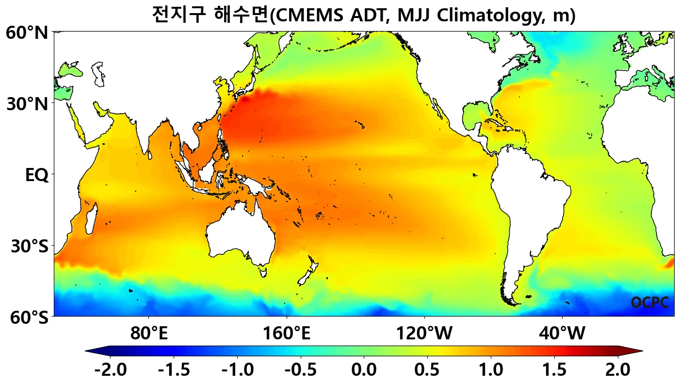 전지구 5~7월 평균 해수면은 평년(0.58±0.03m)보다 높겠습니다.