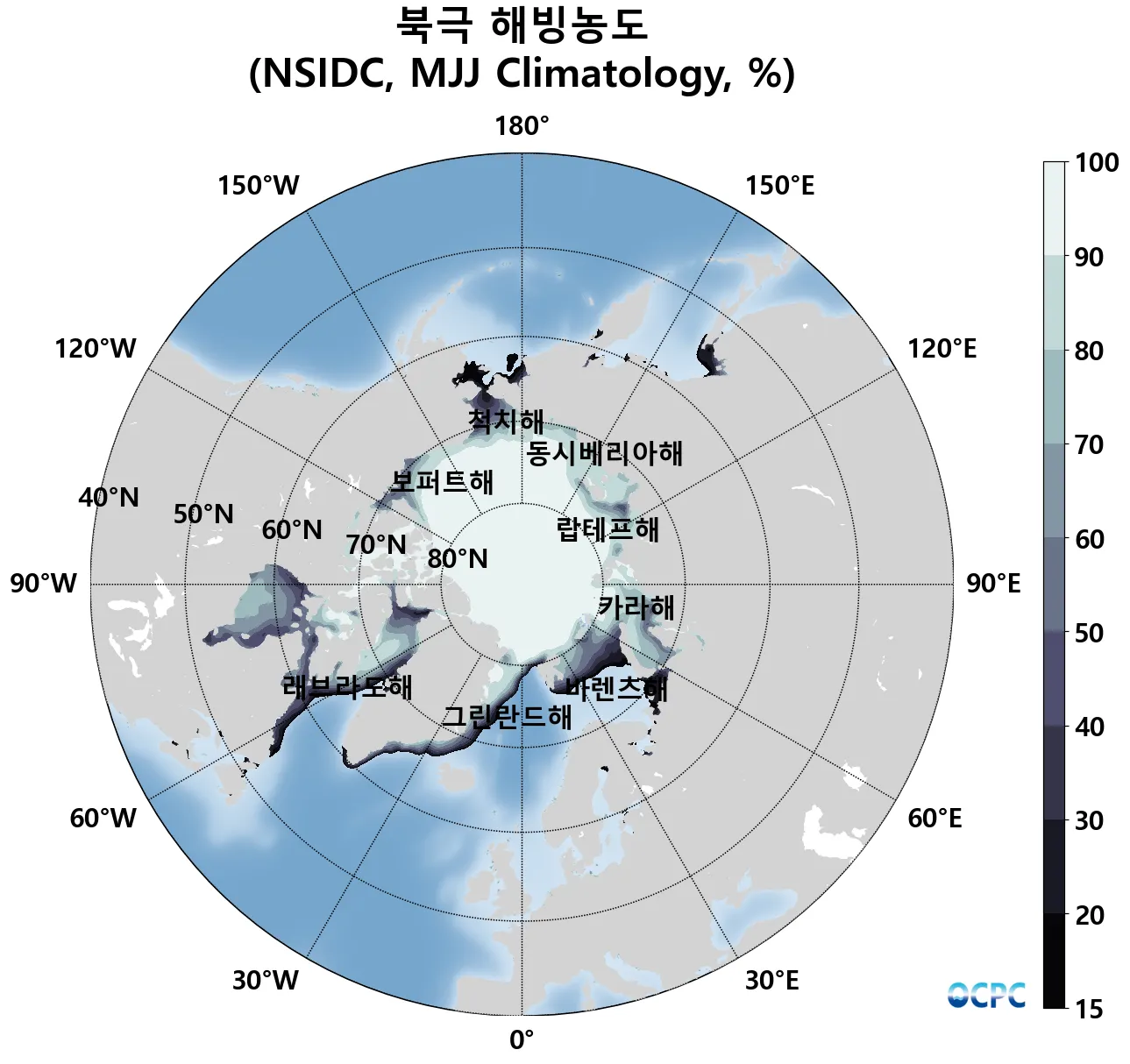 B. 북극 해빙농도(평년 5~7월 평균, 15% 이상 해역)