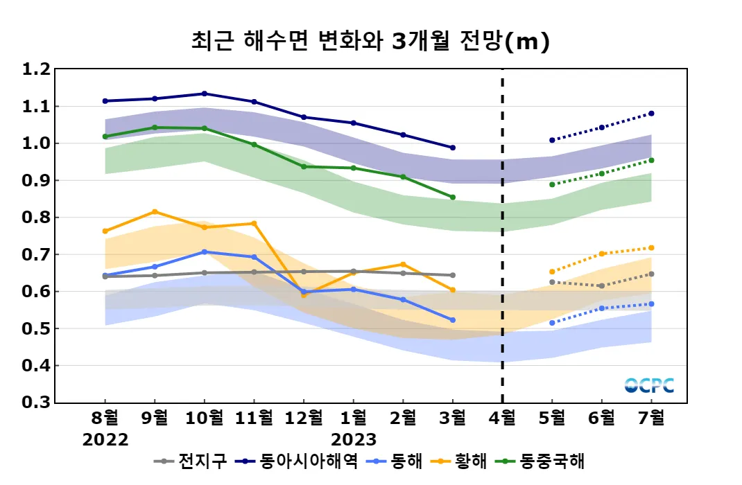 동해와 황해, 동중국해의 5~7월 평균 해수면은 평년(0.48±0.04m, 0.61±0.05m, 0.85±0.04m)보다 높겠습니다.