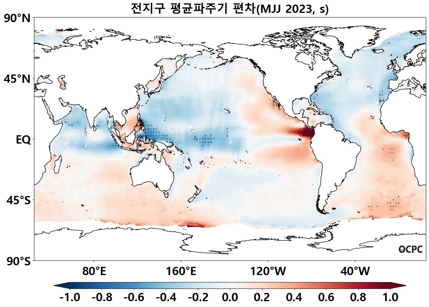 A-B. 전지구 평균파주기 편차 전망(2023년 5~7월 평균, 점표시: 평년 표준편차 초과 해역)