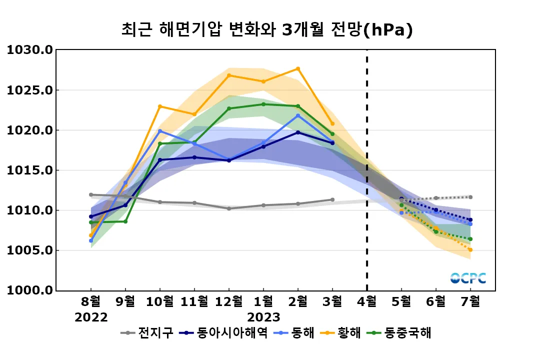 동해, 황해, 동중국해의 5~7월 평균 해면기압은 평년(1009.4±1.4hPa, 1007.7±1.3hPa, 1009.1±1.0hPa)과 비슷하겠습니다.