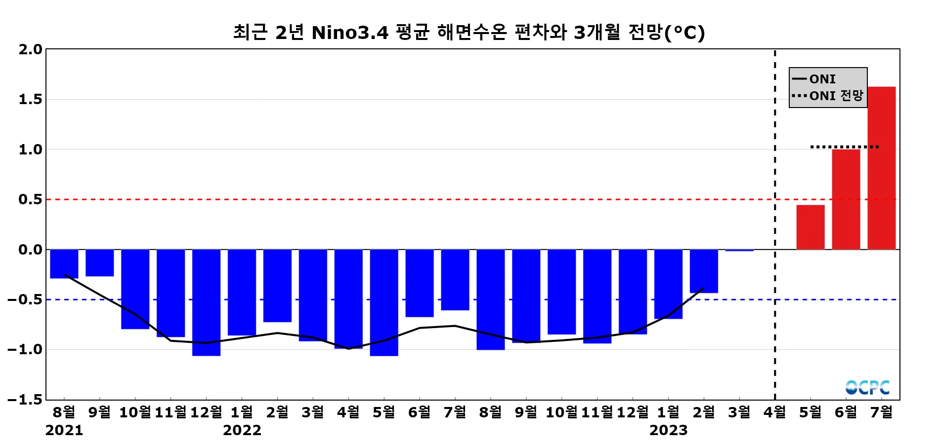 엘니뇨/라니냐 지수(ONI, Ocean Nino Index): 엘니뇨/라니냐 감시구역인 Nino3.4 해역의 월평균 해면수온 편차(채색부분)를 3개월 이동평균하여 나타낸 지수(검정색 실선)로 0.5보다 크면 엘니뇨, -0.5보다 작으면 라니냐로 판정합니다. 과거 지수(최근 2년)는 OISSTv2.1, 전망은 CFSv2 자료에서 산출하였으며, 검정색 점선은 3개월 전망의 평균값을 나타냅니다.