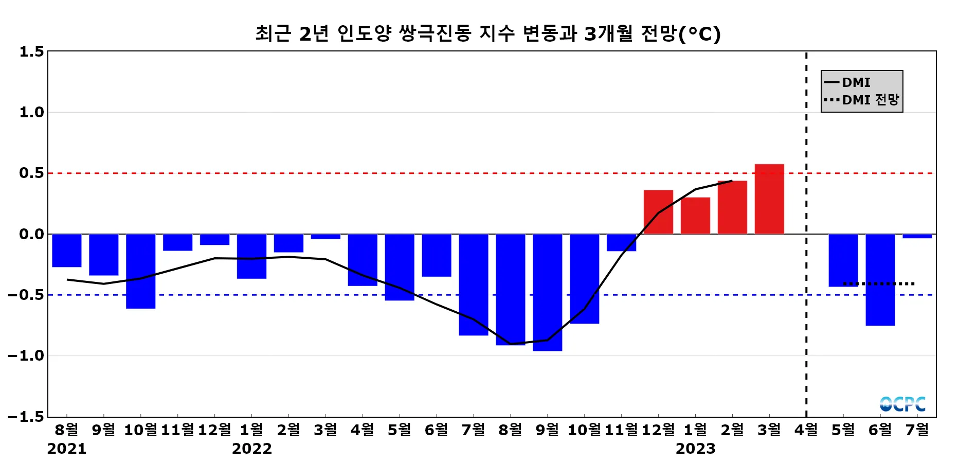 인도양 쌍극진동 지수 DMI (Dipole Mode Index)는 WTIO 해역의 평년 대비 편차에서 SETIO 해역의 평년 대비 편차를 뺀 값으로 월평균 해면수온 편차(채색부분)를 3개월 이동평균하여 나타낸 지수(검정색 실선)로 0.5보다 크면 양의 상태, -0.5보다 작으면 음의 상태로 판정합니다. 과거 지수(최근 2년)는 OISSTv2.1, 전망은 CFSv2 자료에서 산출하였으며, 검정색 점선은 3개월 전망값의 평균값을 나타냅니다.