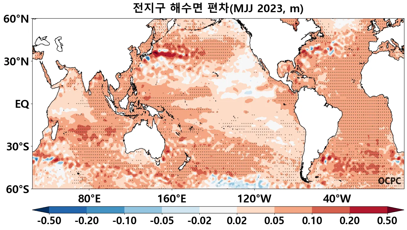 A-B. 전지구 해수면 편차 전망(2023년 5~7월 평균, 점표시: 평년 표준편차 초과 해역)