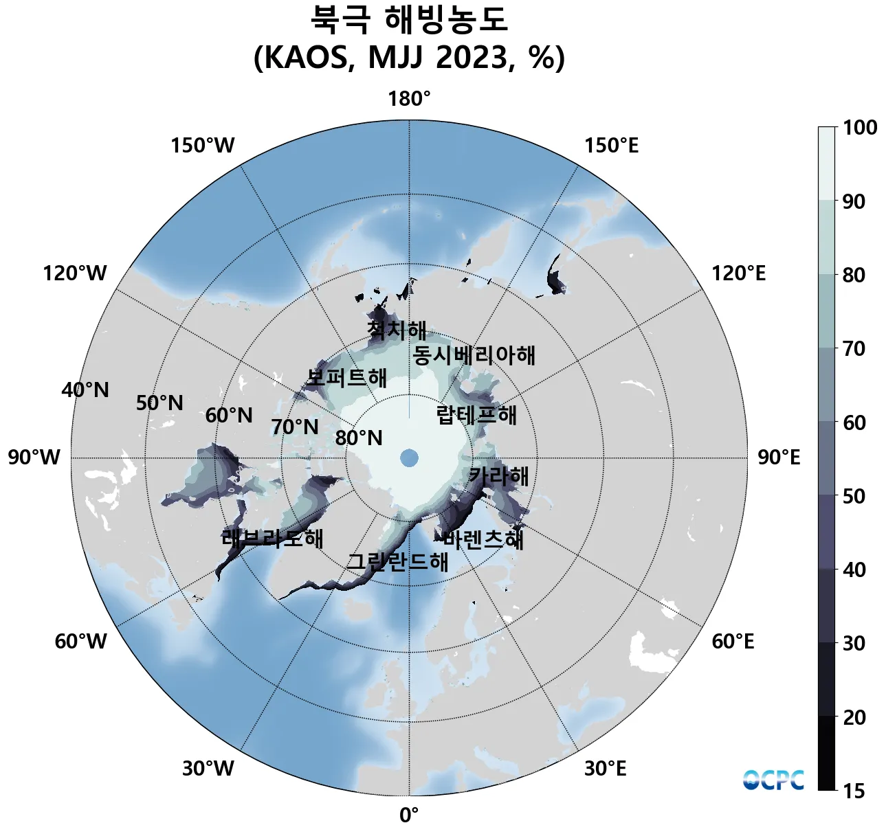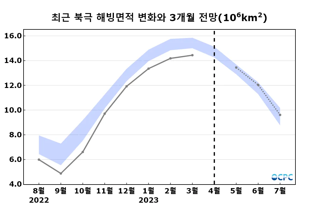 A. 북극 해빙농도 전망(2023년 5~7월 평균, 15% 이상 해역)