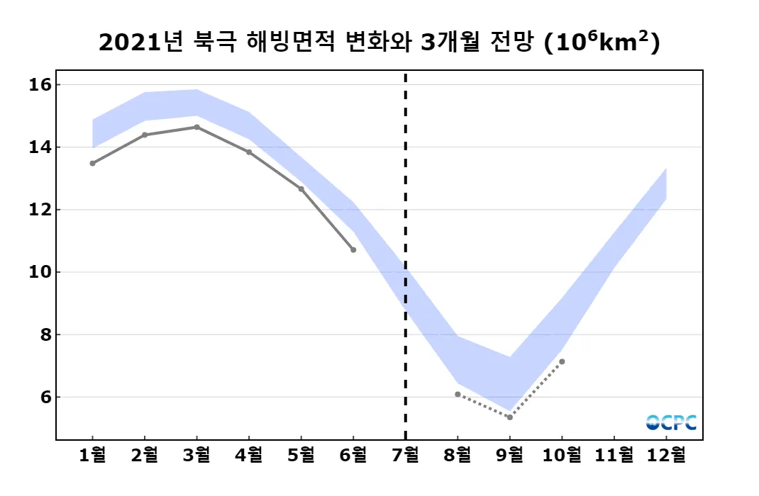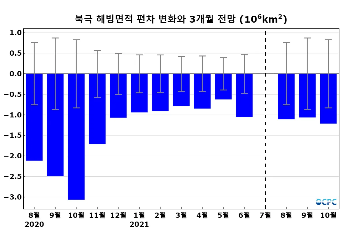 북극 해빙면적은 619만 km²로 평년대비 약 15.5% 감소할 것으로 예상되고, 평년대비 감소율은 9월에 최대(-16.5%)를 보인 후 10월에 감소(-14.5%)할 것으로 예상됩니다.
