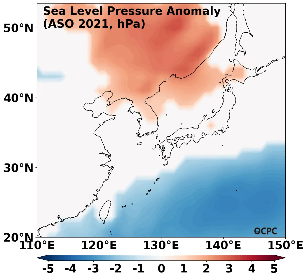 A-B. 한국주변해역 해면기압 편차 전망(2021년 8~10월 평균, 채색표시: 평년 표준편차 초과 해역)