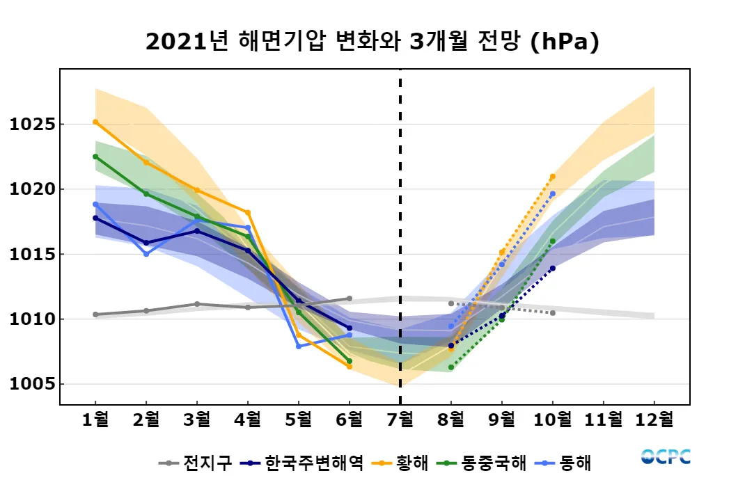 전지구, 한국주변해역의 해면기압은 평년보다 낮겠으며, 황해와 동중국해는 평년과 비슷하고, 동해는 평년보다 높겠습니다.