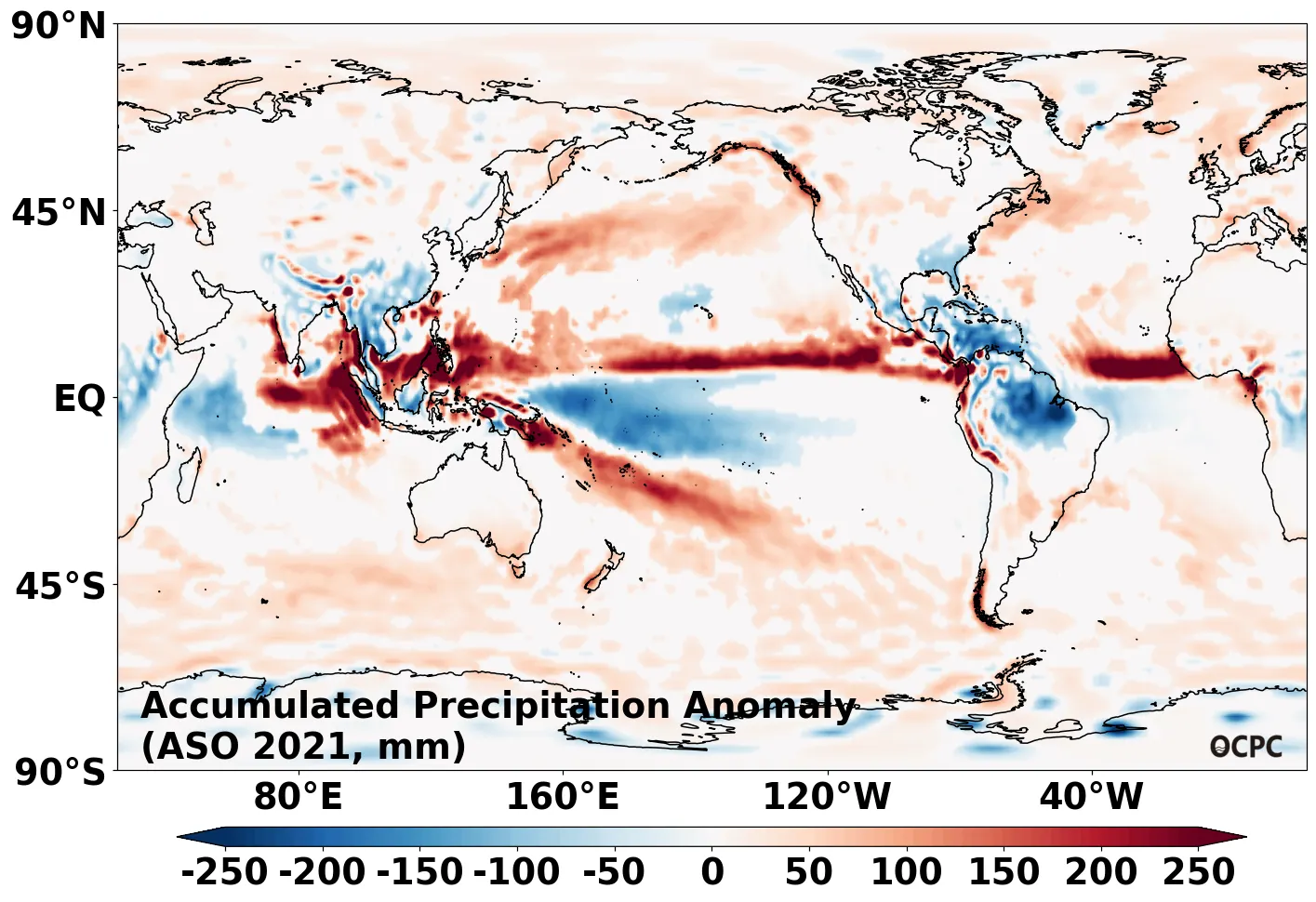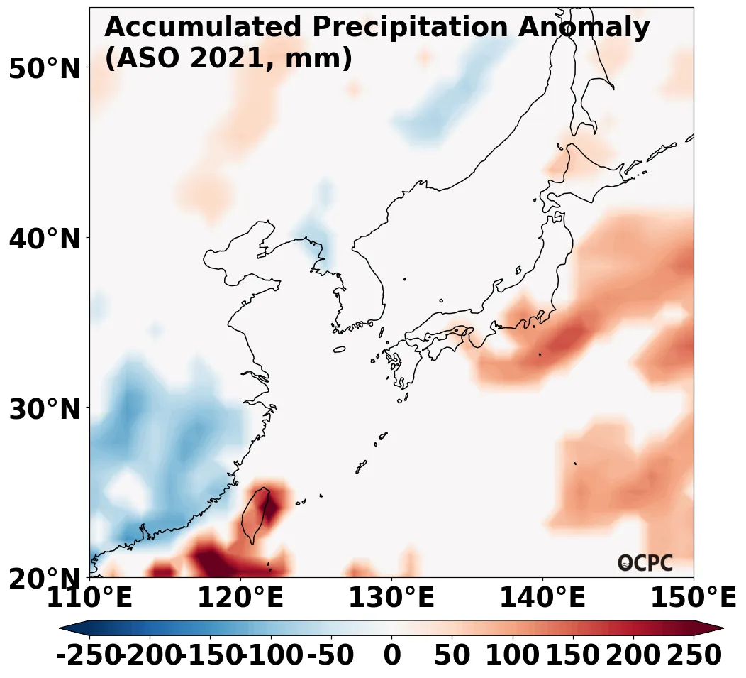 A-B. 전지구 누적강수량 편차 전망(2021년 8~10월 평균, 채색표시: 평년 표준편차 초과 해역)