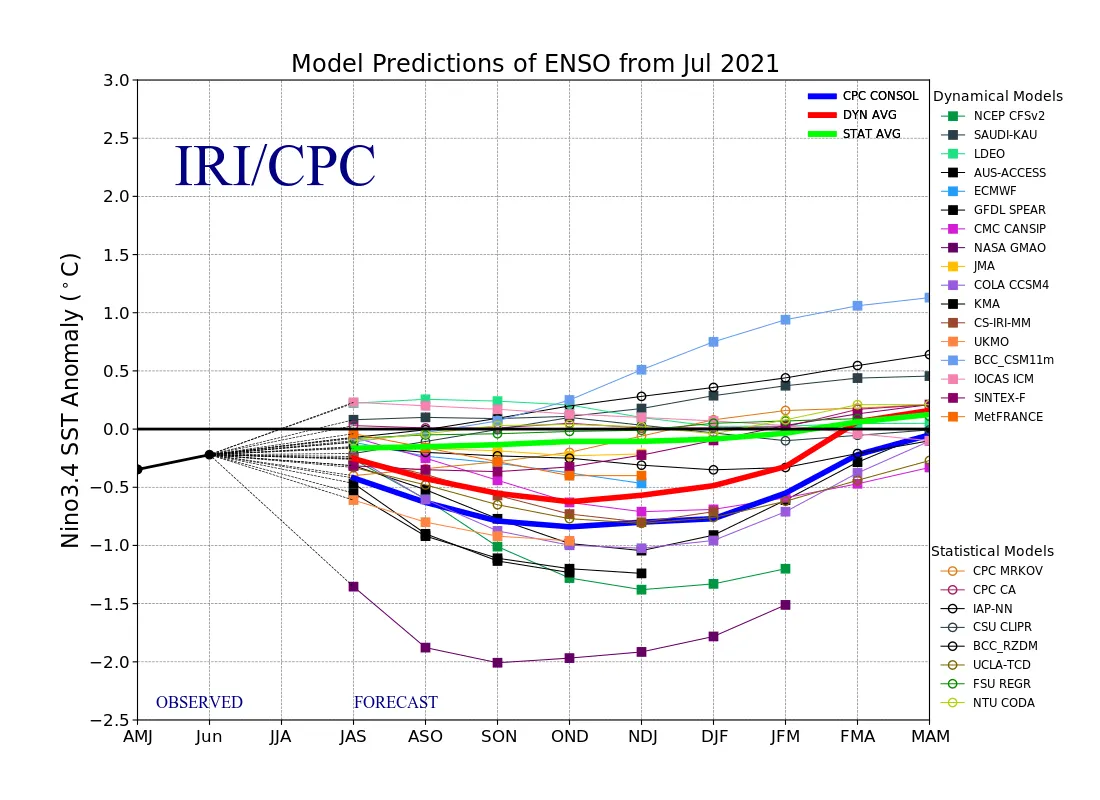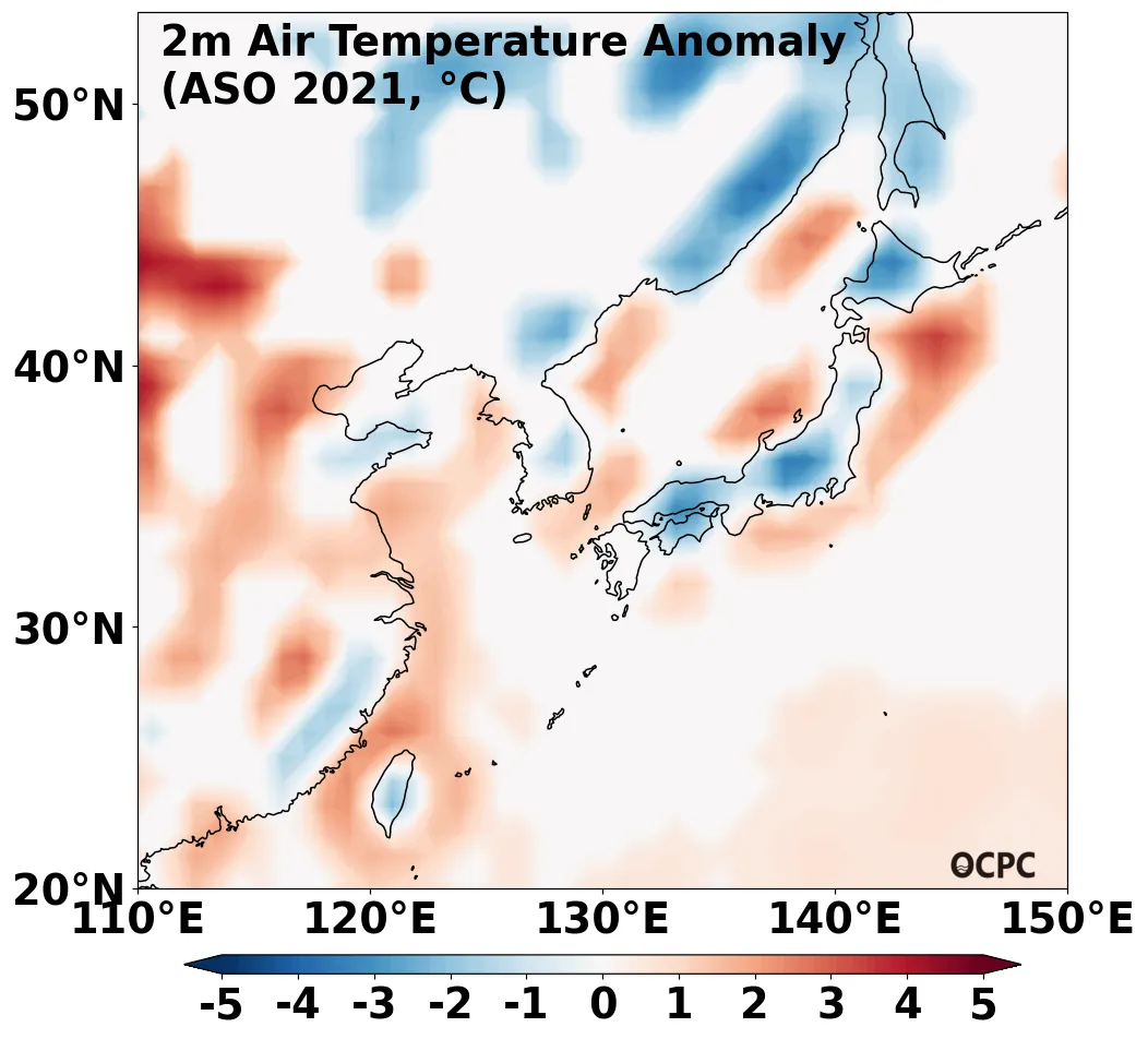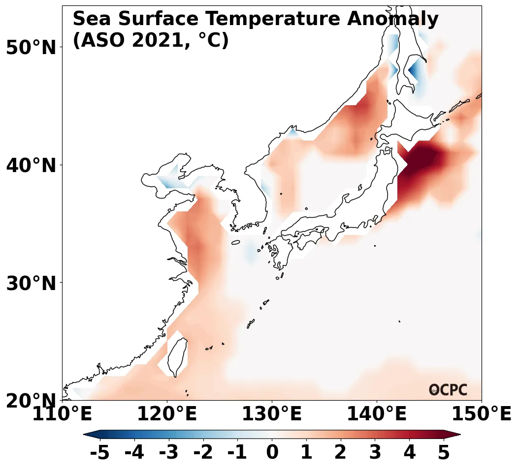 엘니뇨/라니냐 감시구역인 Nino3.4 해역(5 °S ~ 5 °N, 170 °W ~ 120 °W)의 8~10월(ASO) 해면수온 편차는 평년 수준 또는 약한 라니냐 상태가 될 것으로 전망됩니다.