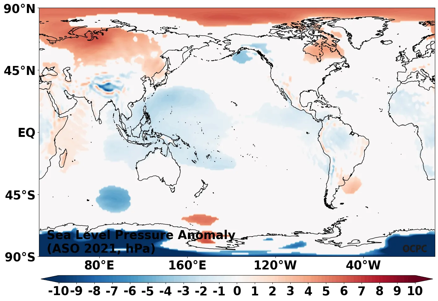 A-B. 전지구 해면기압 편차 전망(2021년 8~10월 평균, 채색표시: 평년 표준편차 초과 해역)
