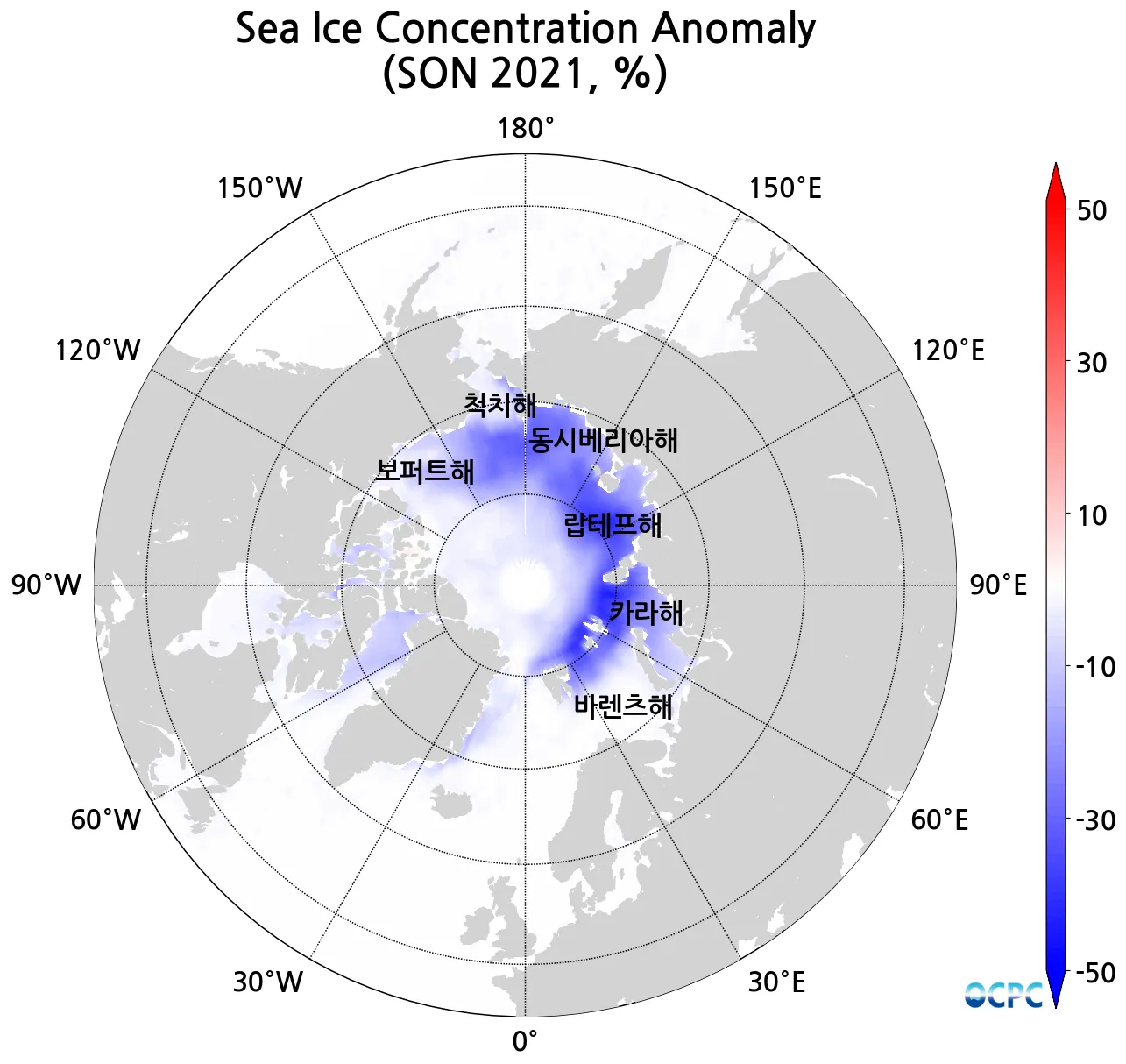 북극 해빙농도의 음의 편차는 랍테프해, 카라해, 바렌츠해 섹터를 중심으로 척치해와 동시베리아해로 확장될 것이나 보퍼트해에서는 상대적으로 약할 것으로 예상됩니다.