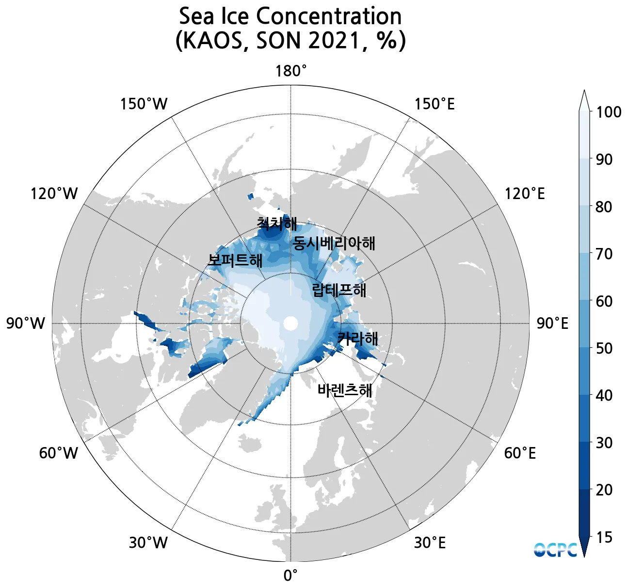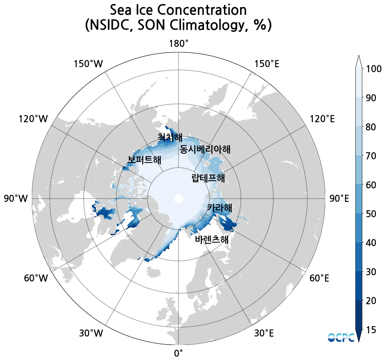 B. 북극 해빙농도(8~10월 평년평균, 15% 이상 해역)
