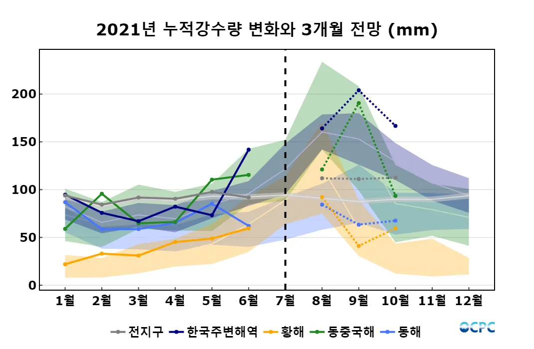 전지구, 한국주변해역의 해상강수량은 평년보다 많겠으며, 황해, 동해, 동중국해의 해상강수량은 평년과 비슷하겠습니다.
