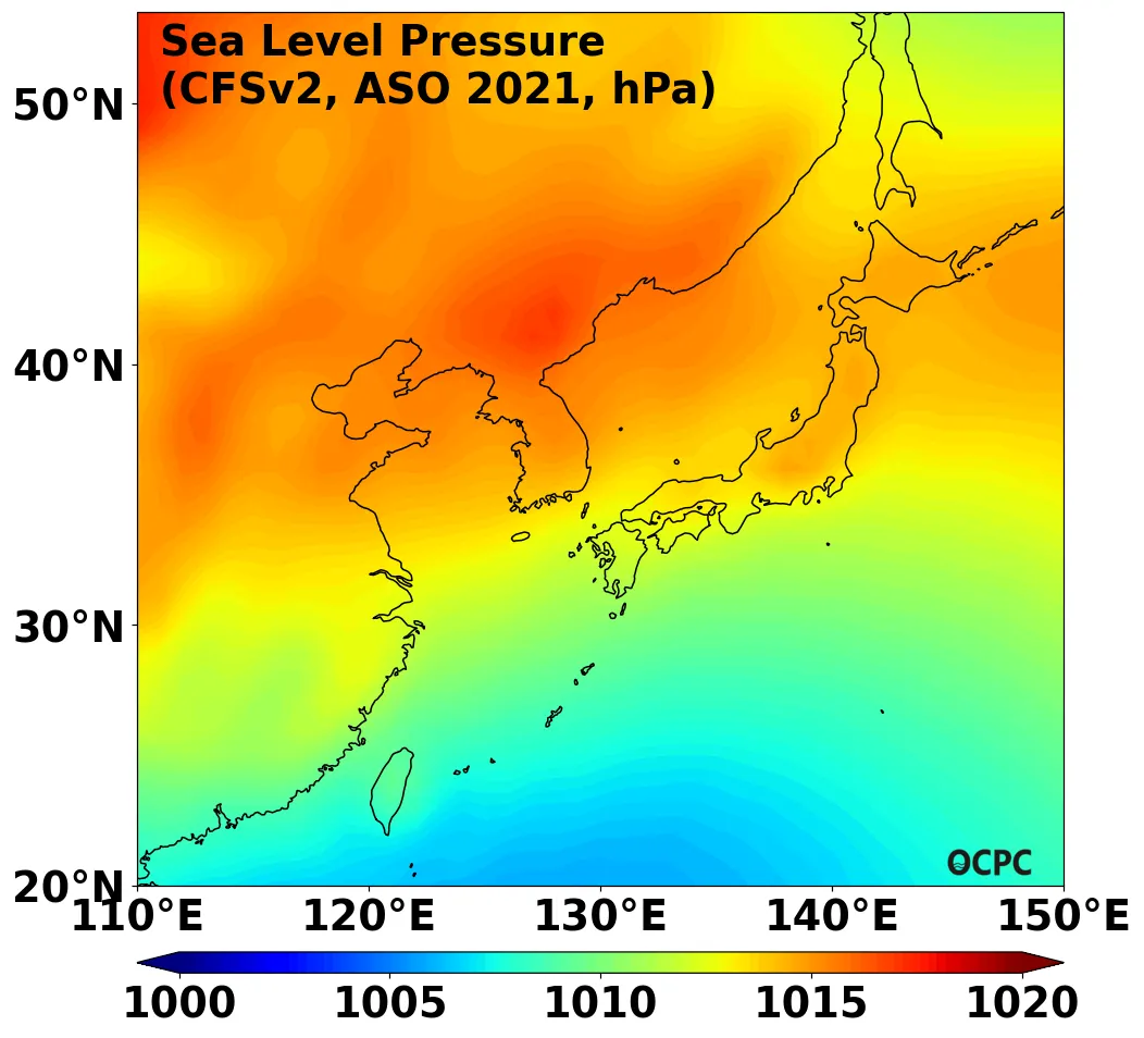 A. 한국주변해역 해면기압 전망(2021년 8~10월 평균)