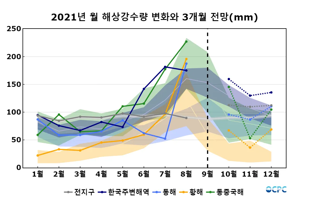 동해와 황해의 해상강수량도 평년보다 많겠으나, 동중국해는 평년과 비슷하겠습니다.