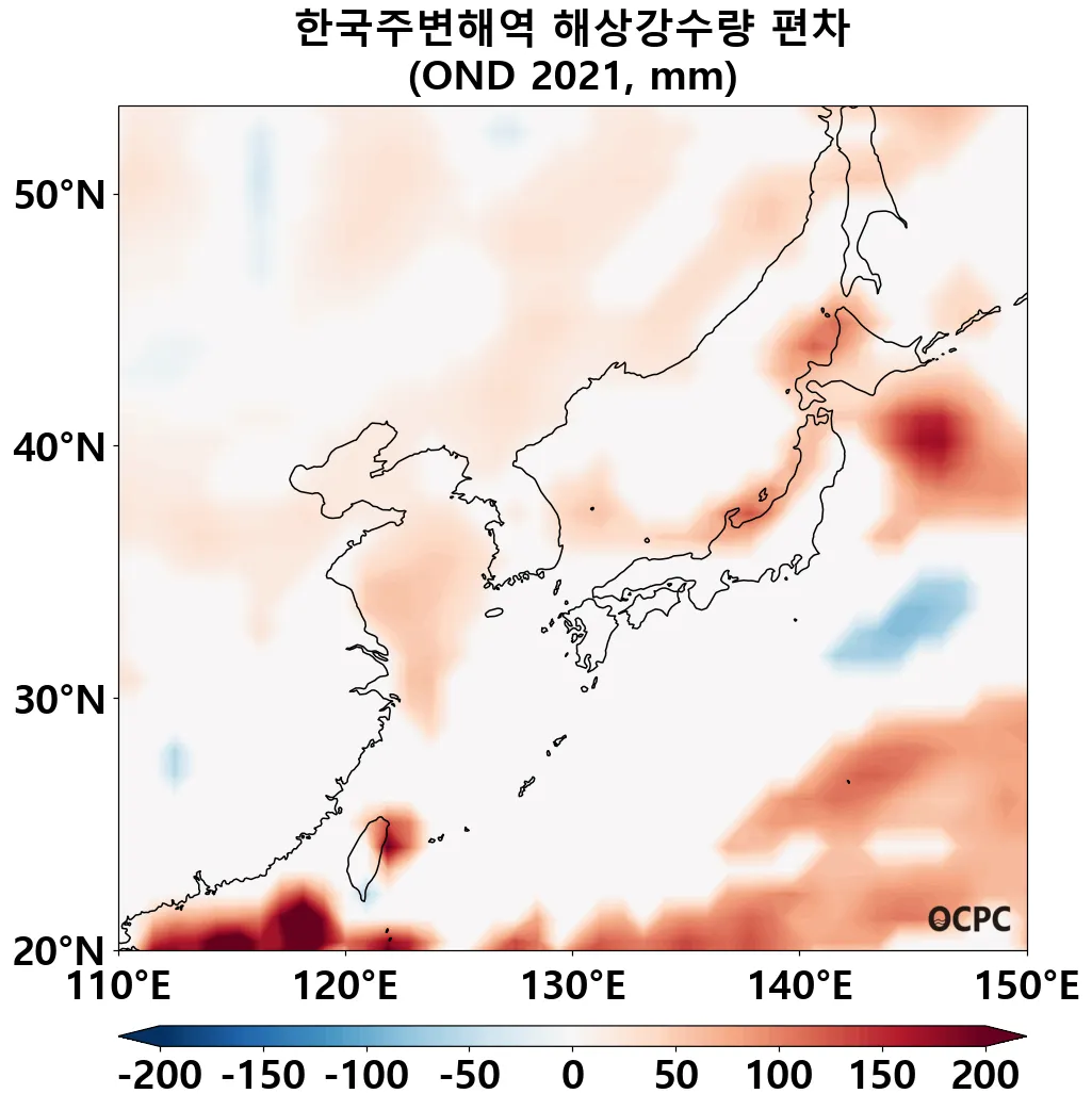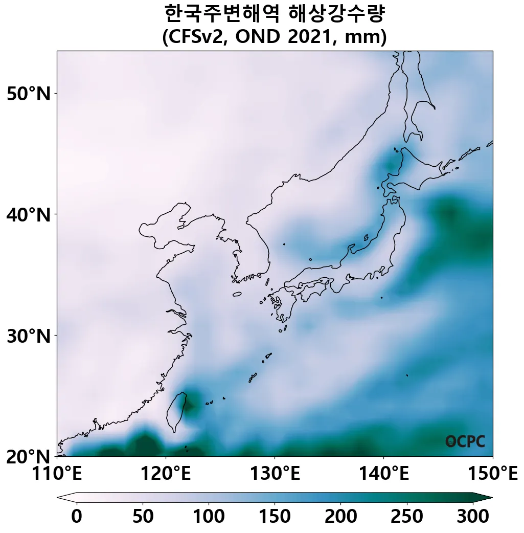 A. 한국주변해역 누적강수량 전망(2021년 10~12월 평균)