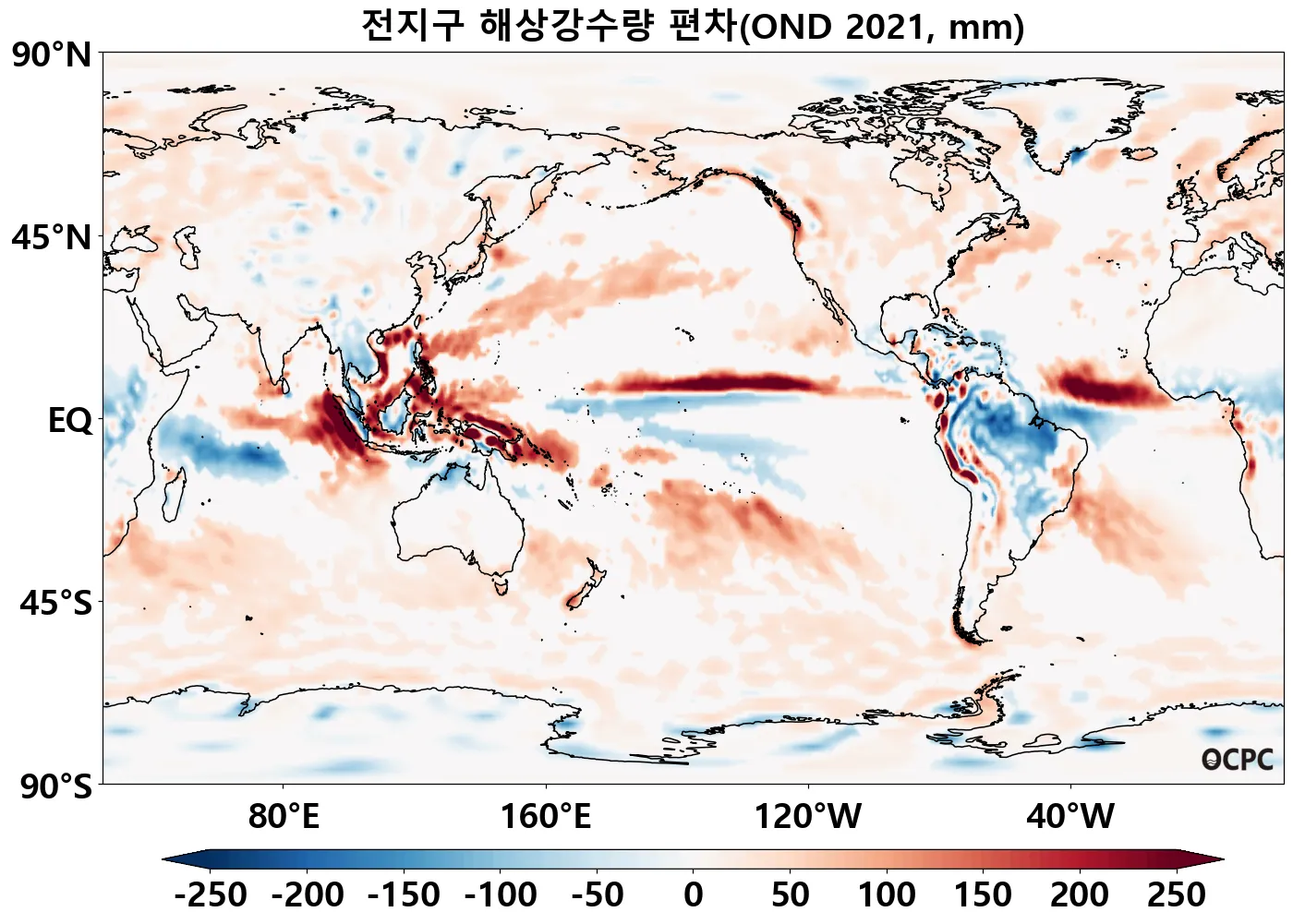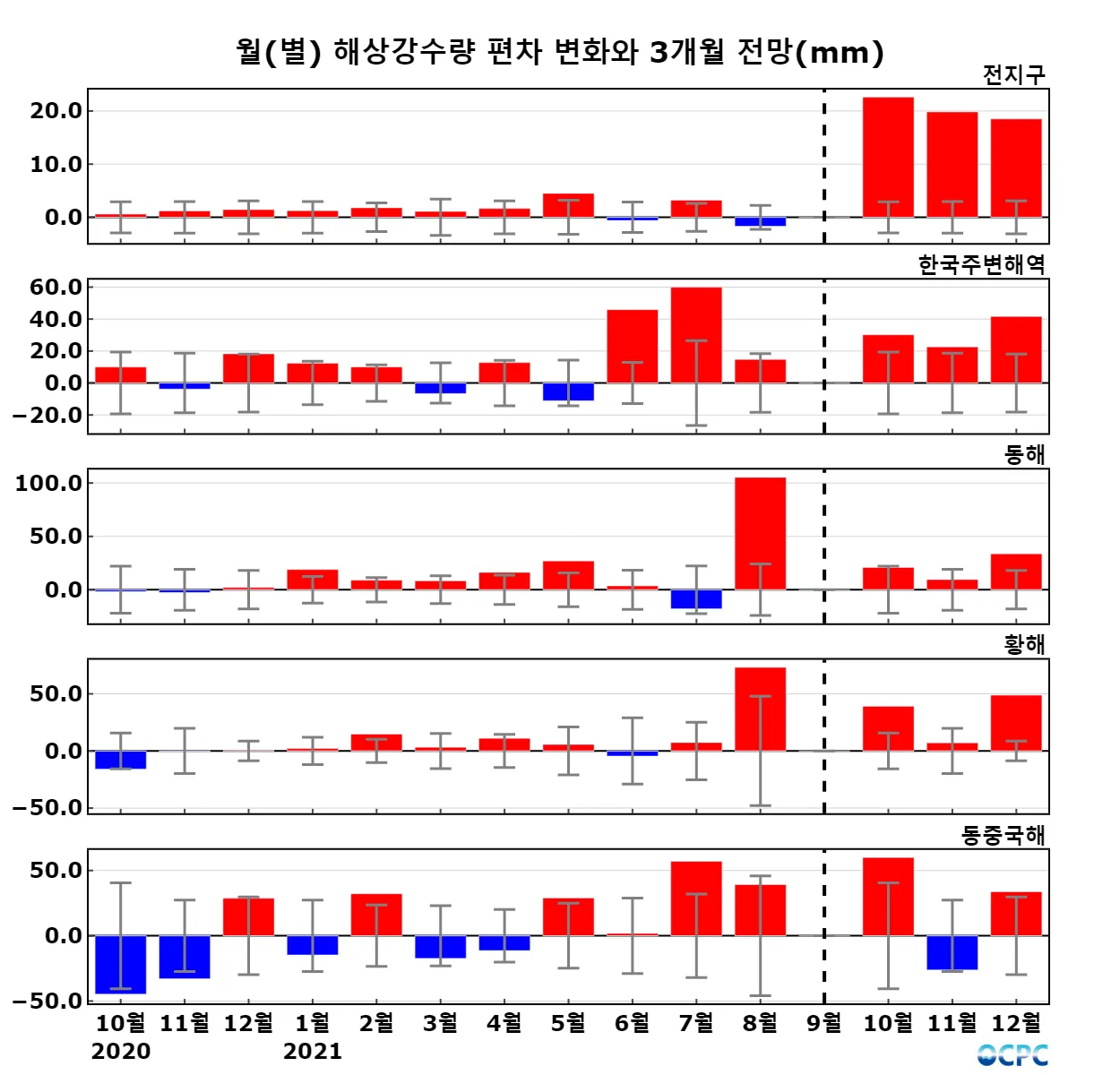 A-B. 전지구 해상강수량 편차 전망(2021년 10~12월 평균, 채색표시: 평년 표준편차 초과 해역)