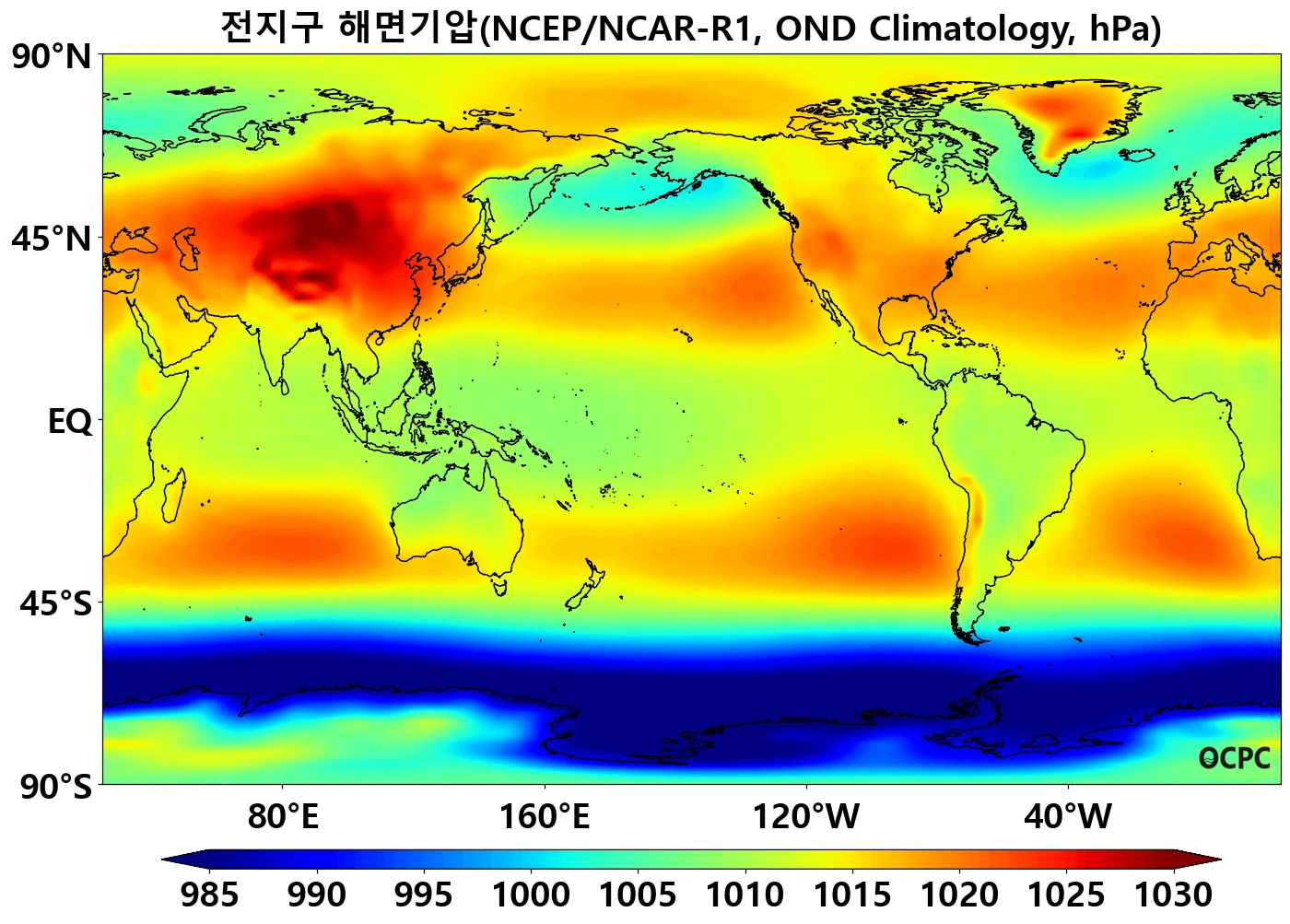○ (해면기압) 전지구 해면기압은 평년보다 낮겠으며, 한국주변해역은 평년과 비슷하겠습니다.