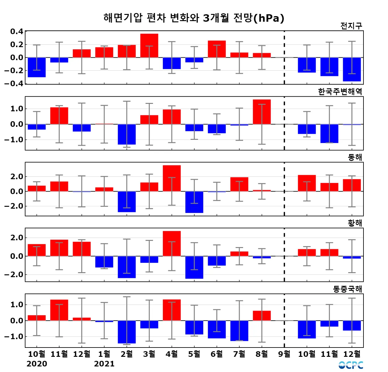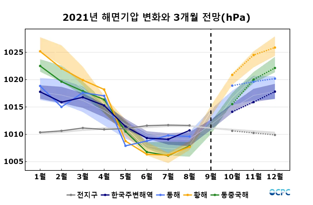 전지구 해면기압은 평년보다 낮겠으며, 한국주변해역은 평년과 비슷하겠습니다.