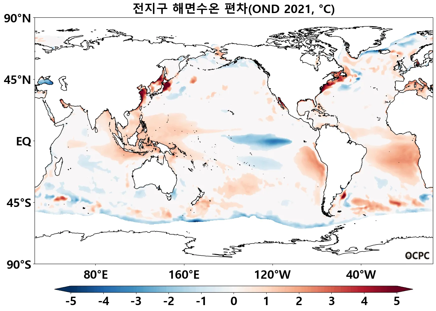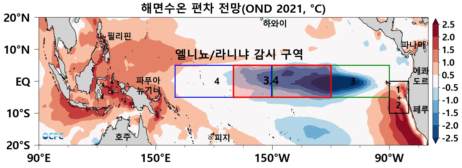 엘니뇨/라니냐 감시구역인 Nino3.4 해역(5°S~5°N, 170°W~120°W)의 10~12월(OND) 해면수온 편차는 약한 라니냐 상태가 될 것으로 전망됩니다.