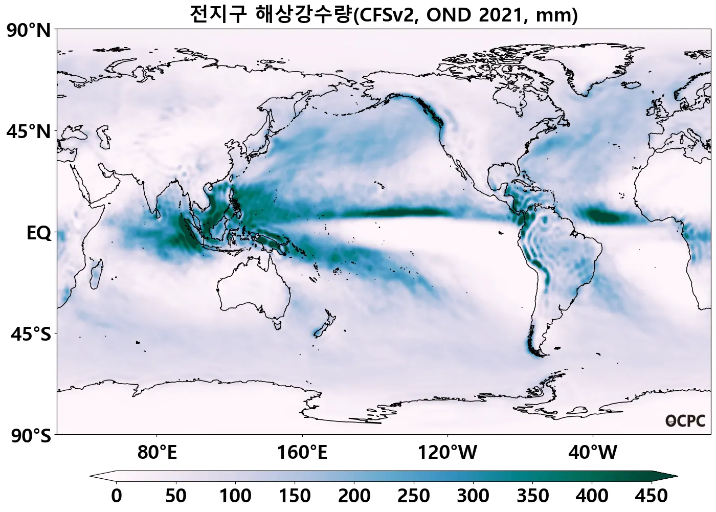 A. 전지구 해상강수량 전망(2021년 10~12월 평균)