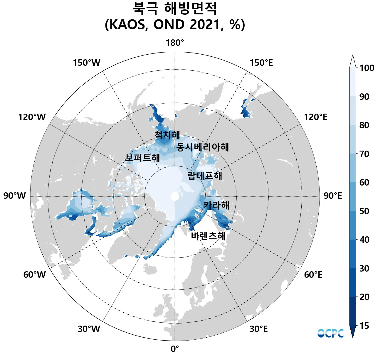 A. 북극 해빙농도 전망(2021년 10~12월 평균, 15% 이상 해역)