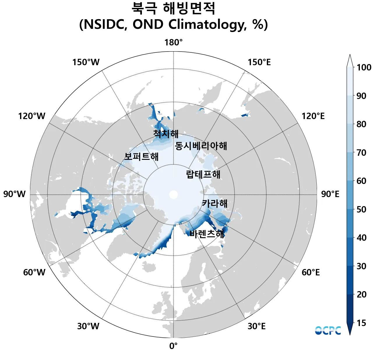 B. 북극 해빙농도(10~12월 평년평균, 15% 이상 해역)