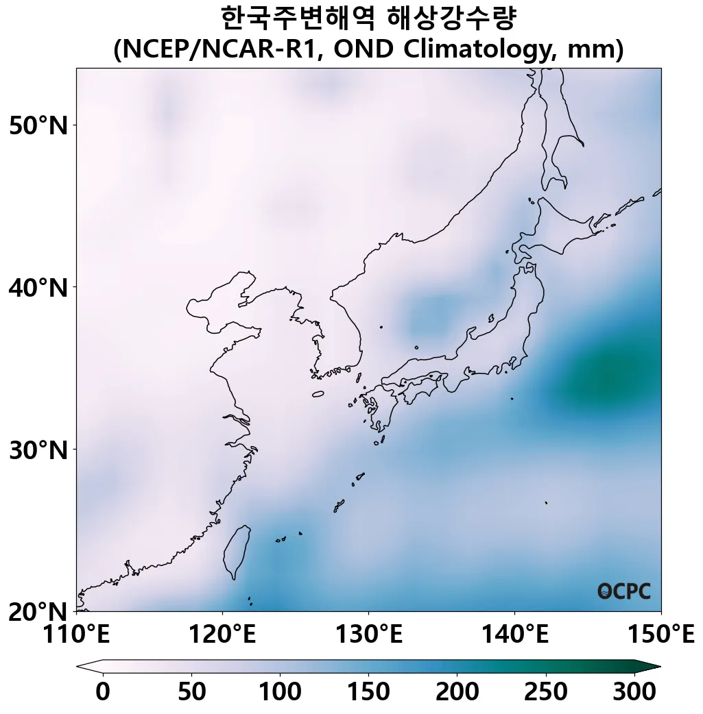 B. 한국주변해역 누적강수량(10~12월 평년평균)