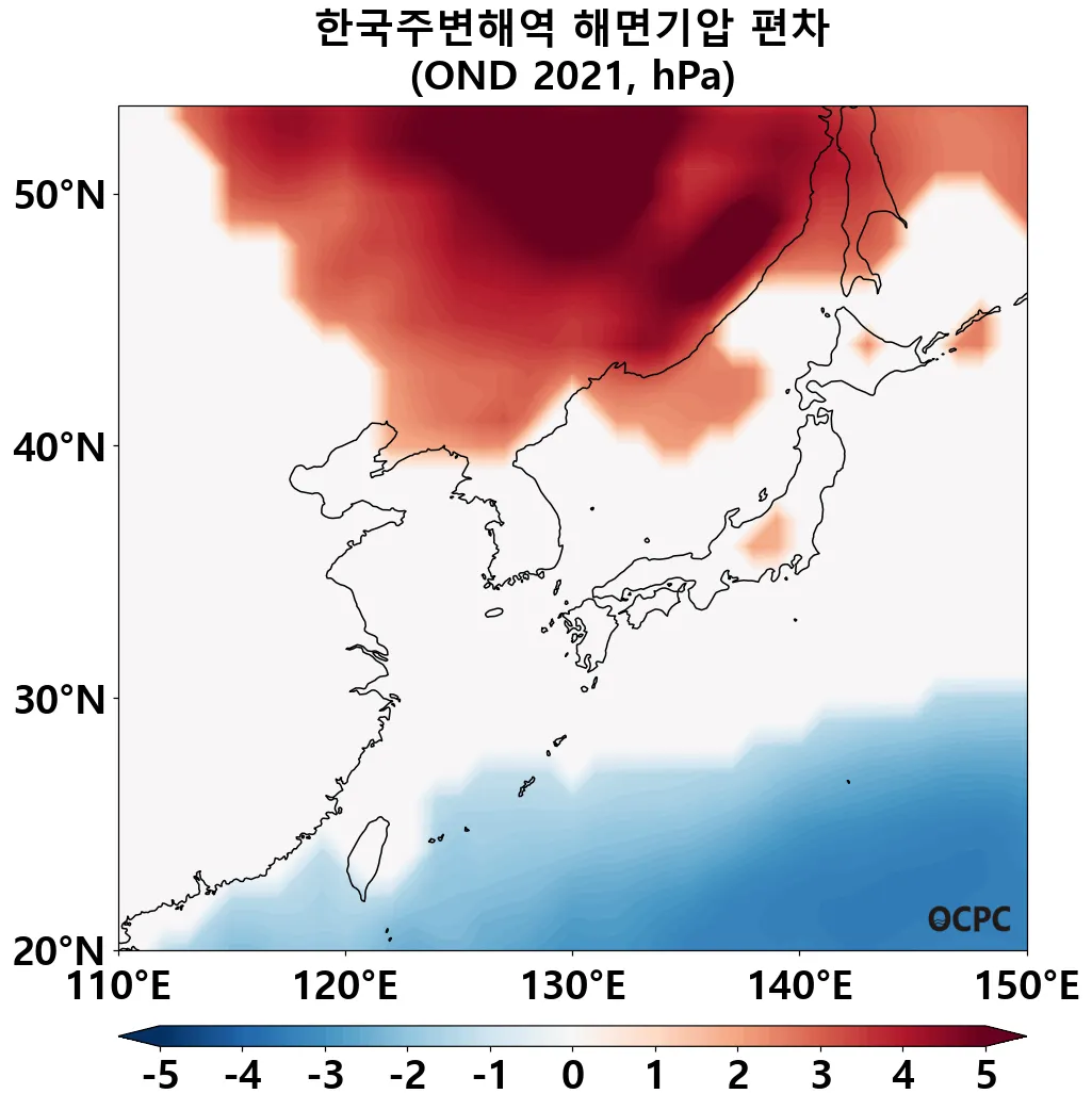 A-B. 한국주변해역 해면기압 편차 전망(2021년 10~12월 평균, 채색표시: 평년 표준편차 초과 해역)