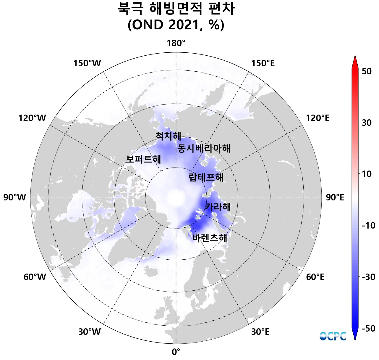 A-B. 북극 해빙농도 편차 전망(2021년 10~12월 평균, 15% 이상 해역)