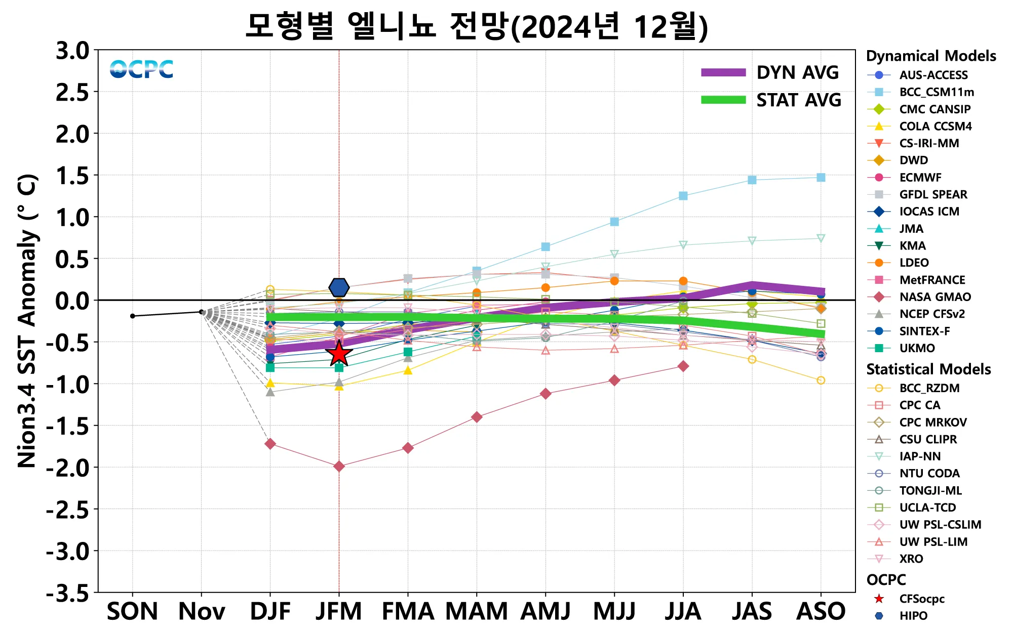 다양한 통계/역학 모형 결과(International Research Institute for Climate and Society, Columbia Univ.) 및 해양기후예측센터에서 산출된 Nino3.4 해역 해면수온 편차 전망