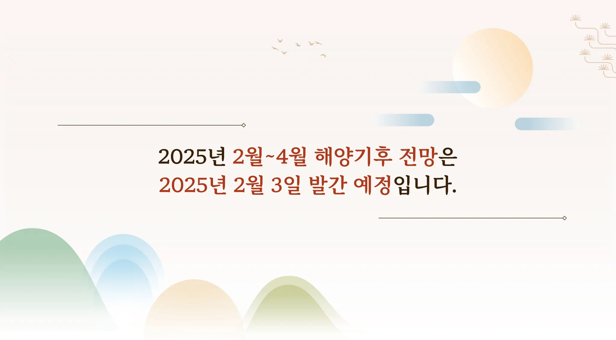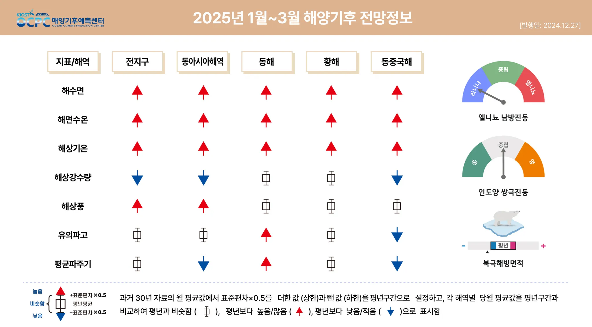 3개월(1, 2, 3월) 평균 전망: 해수면, 해면수온, 해상기온은 전지구, 동아시아해역에서 평년보다 높겠으며, 북극 해빙면적은 평년보다 작겠습니다. 열대 태평양에 라니냐가 발생할 것으로 전망됩니다.