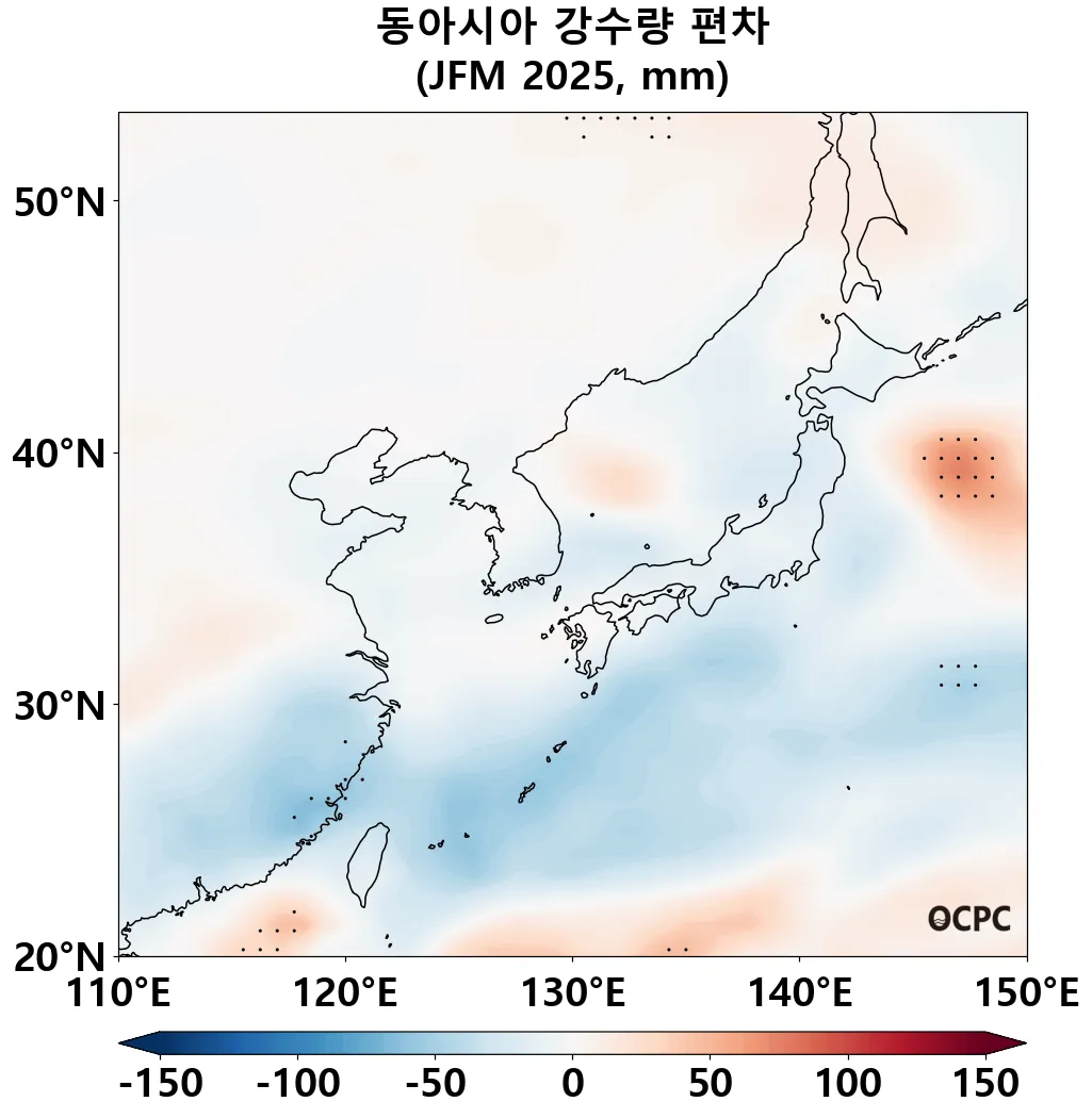 A-B. 동아시아 강수량 편차 전망(2025년 1월~3월 평균점표시: 평년 ±2 표준편차 초과해역)