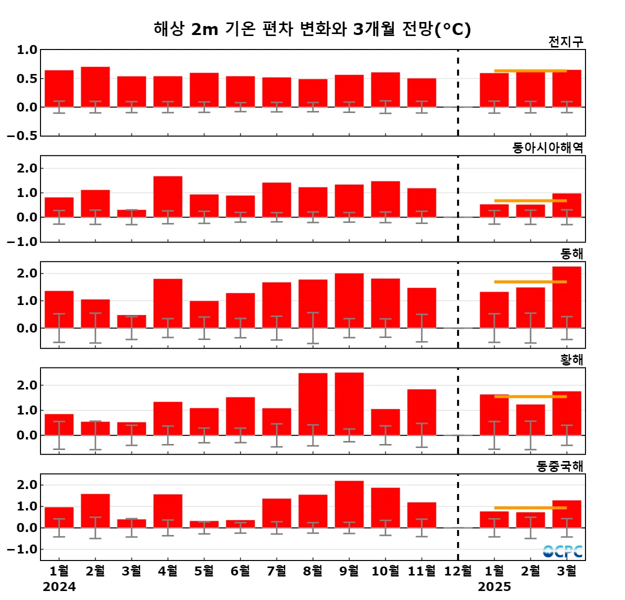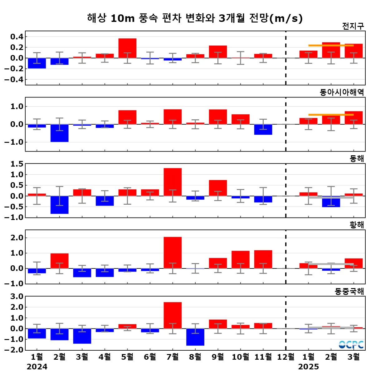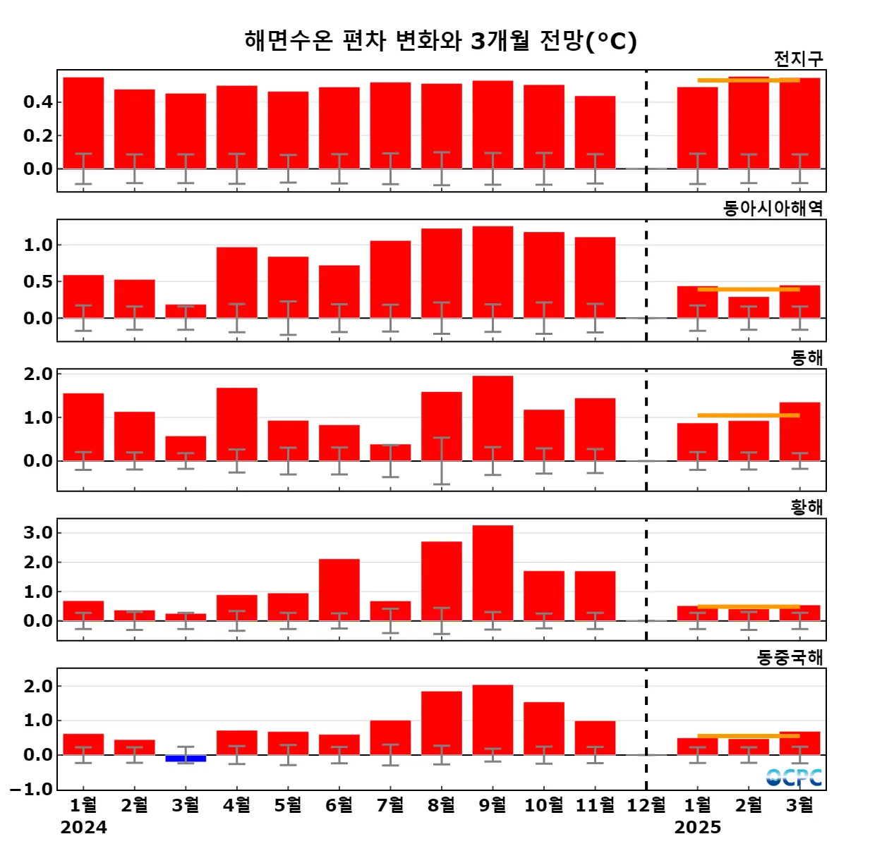 구간표시선: 평년평균±0.5 표준편차, 가로실선: 3개월 평균 편차 전망 (주황색: 높음, 회색: 비슷함, 하늘색: 낮음)