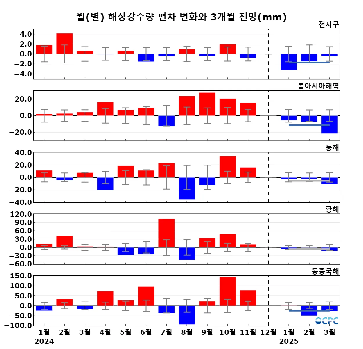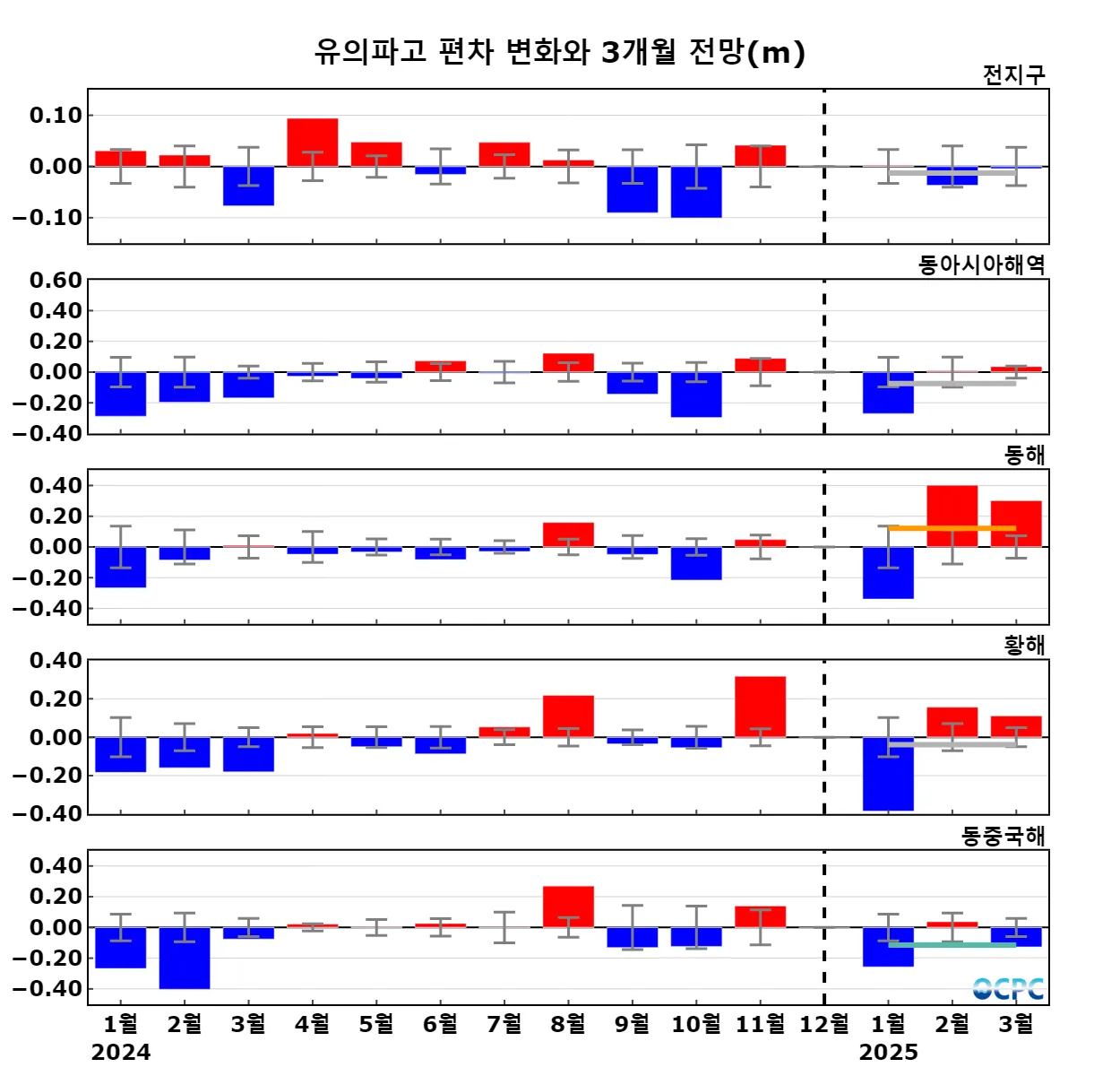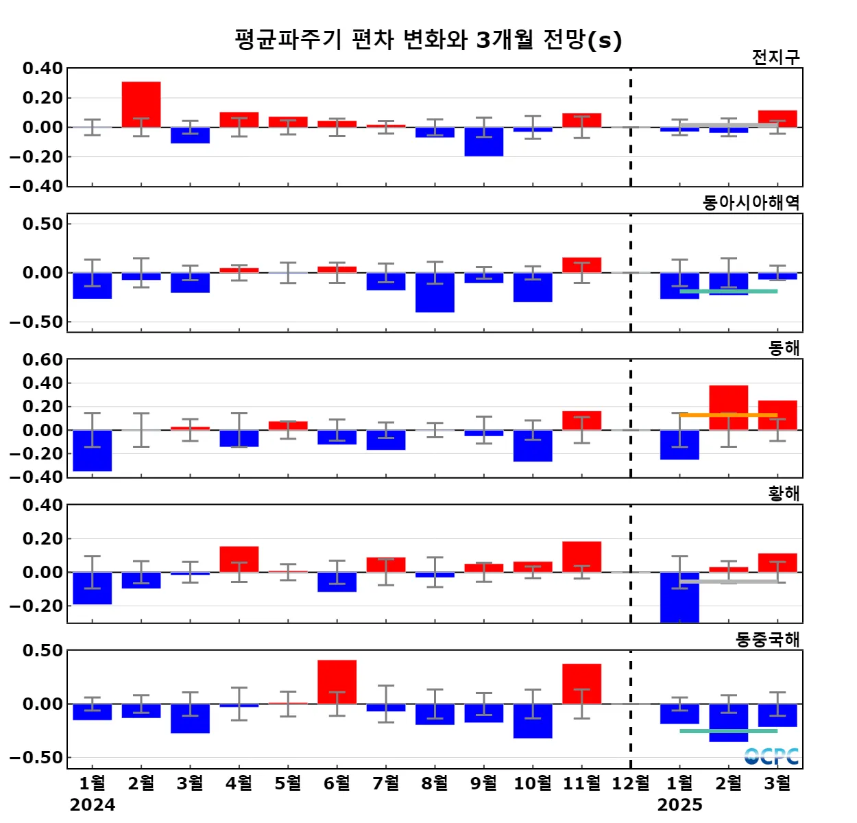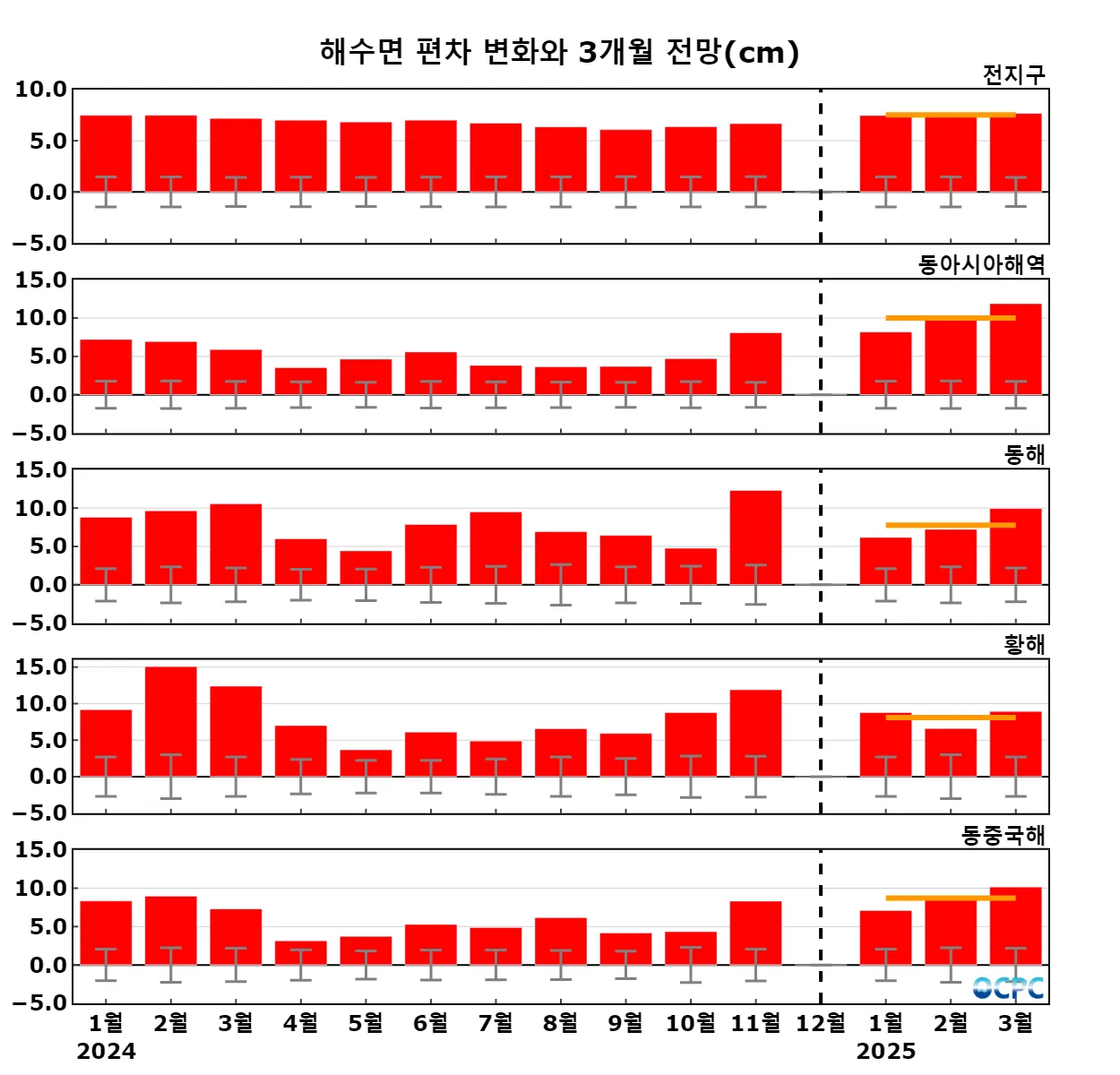 구간표시선: 평년평균±0.5 표준편차, 가로실선: 3개월 평균 편차 전망 (주황색: 높음, 회색: 비슷함, 하늘색: 낮음)