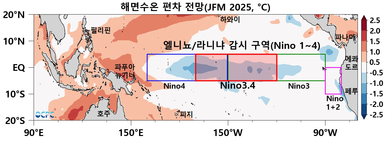 엘니뇨/라니냐 감시구역인 Nino3.4 해역(5°S~5°N, 170°W~120°W)의 12월 1~20일 평균 해면수온 편차는 -0.6℃로 라니냐 상태이며, 1~3월(JFM) 평균 해면수온 편차는 -0.5℃ 이하로 라니냐 상태가 전망됩니다.