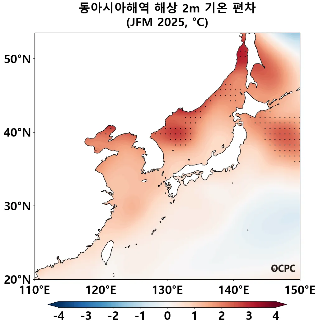 A-B. 동아시아해역 해상기온 편차 전망(2025년 1월~3월 평균, 점표시: 평년 ±2 표준편차 초과해역)
