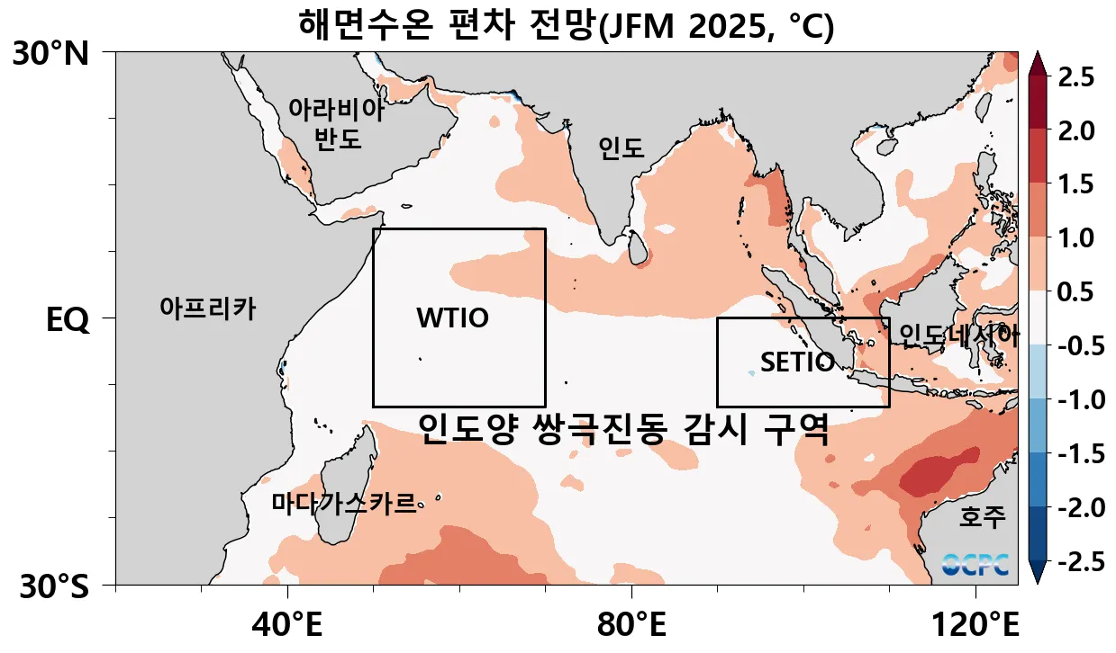 2025년 1월까지는 남동인도양 해역에서 서인도양 해역보다 높은 해면수온 편차를 나타내지만 2월부터는 반대의 양상이 나타날 것으로 전망됩니다.
