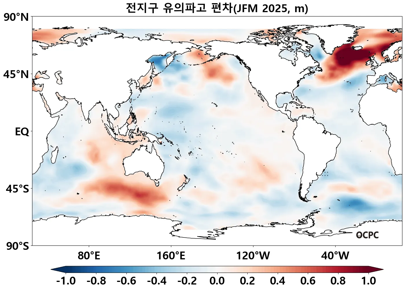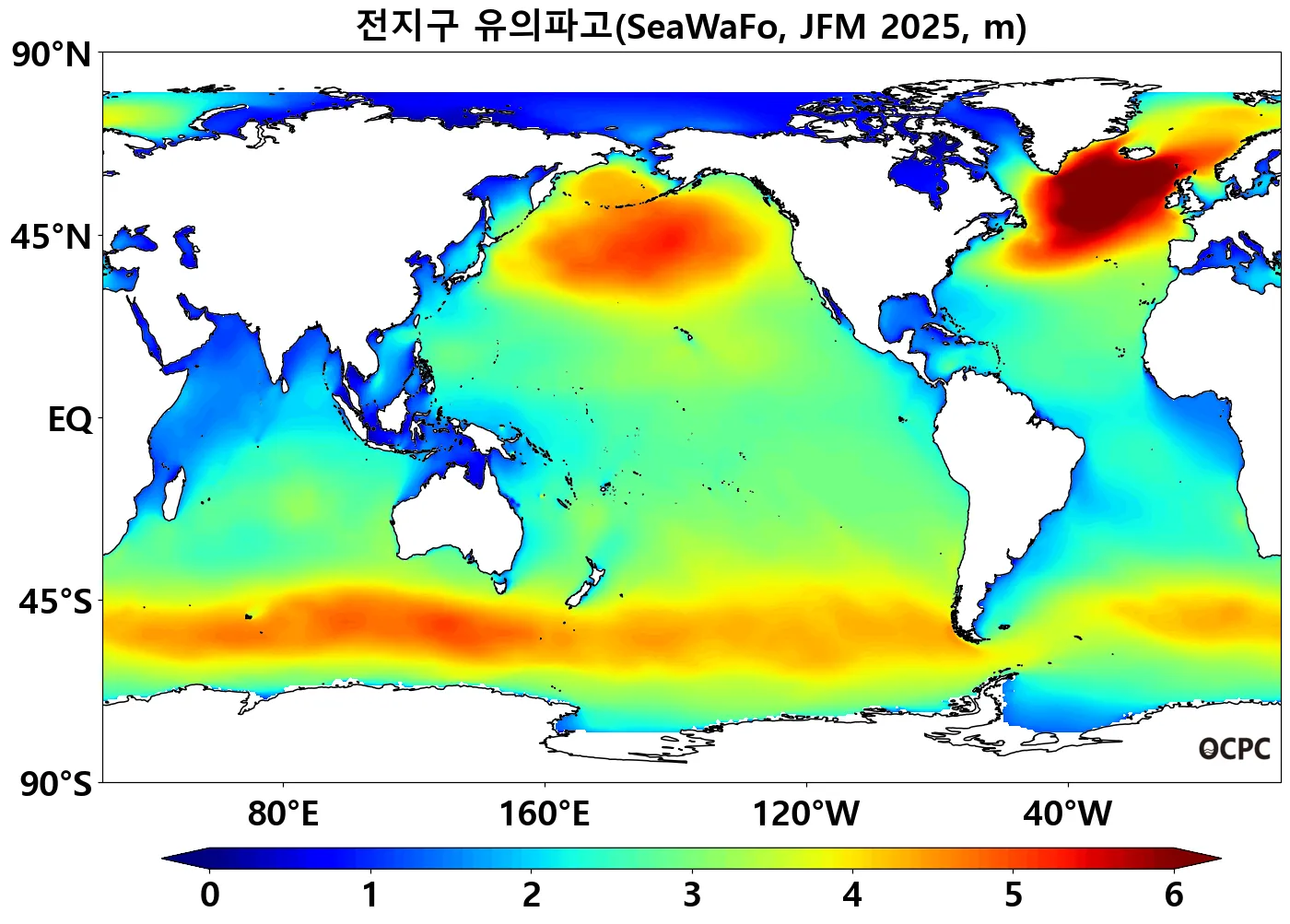 전지구 1~3월 평균 유의파고는 평년(2.92±0.04m)과 비슷할 것으로 전망됩니다.