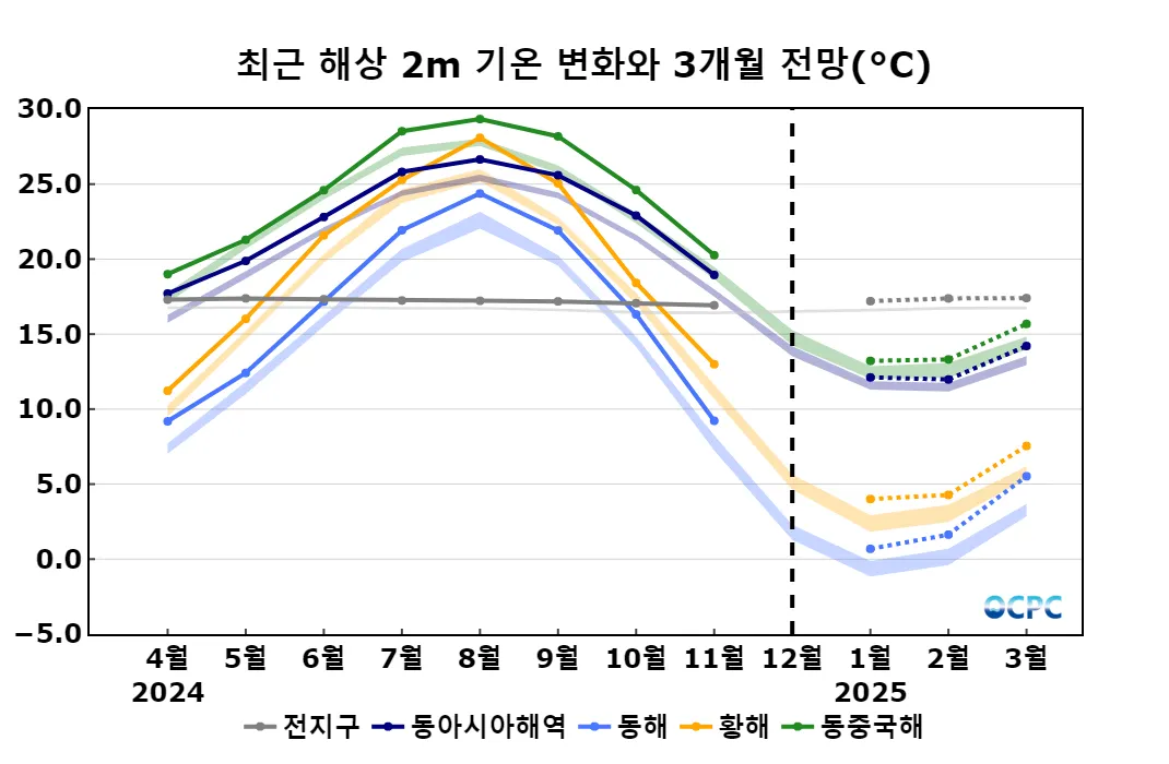 동해, 황해, 동중국해의 1~3월 평균 해상기온은 평년(0.9±0.5℃, 3.7±0.5℃, 13.1±0.4℃)보다 높겠습니다.
