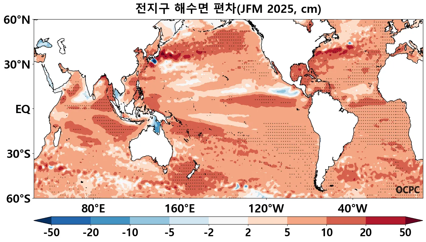 전지구 1~3월 평균 해수면은 평년(58±1cm)보다 높겠으며, 열대 동인도양 및 남대서양, 중위도 북동태평양 및 뉴질랜드 인근 해역에서 평년 2 표준편차를 초과하는 높은 해수면 편차가 전망됩니다.