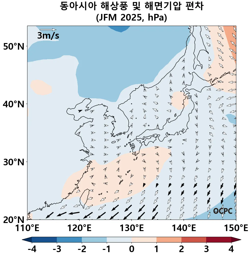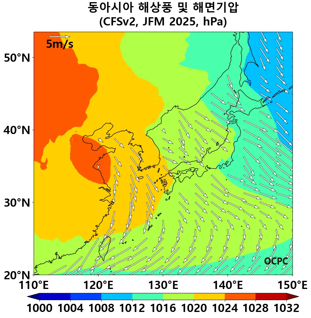 A. 동아시아 해상풍 및 해면기압 전망(2025년 1월~3월 평균)