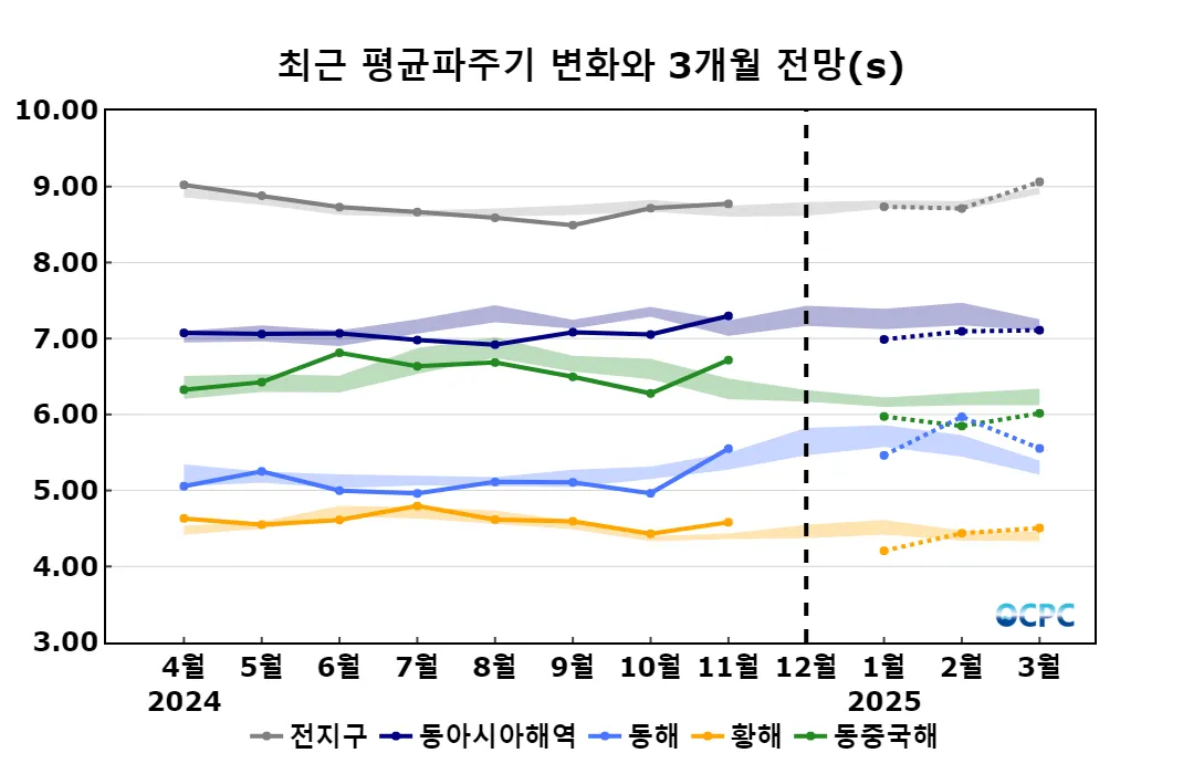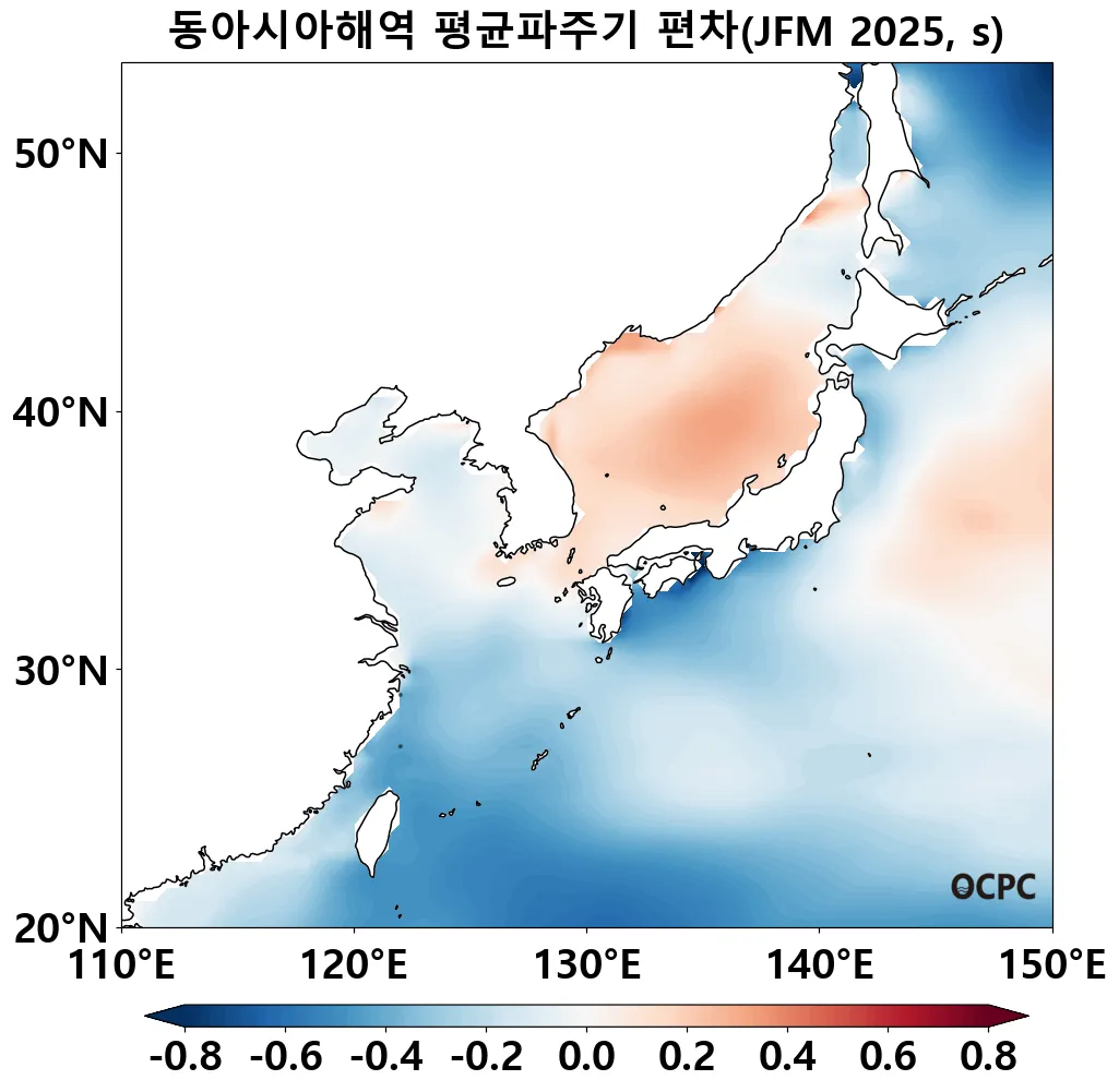 동아시아해역의 1~3월 평균파주기는 평년(7.25±0.12초)보다 감소할 것으로 전망됩니다.