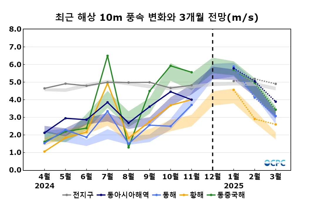 동아시아해역의 1~3월 평균 해상풍은 평년(4.4±0.3m/s)보다 강하겠습니다.